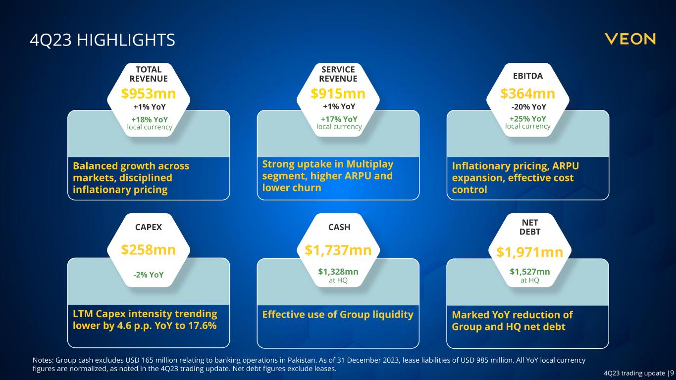 8 4Q23交易更新| 2023财年8影响集团有机财务业绩的同比业绩因素1 2022年第四季度和2023年第四季度与俄罗斯退出和其他总部一次性相关的一次性费用2022年在巴基斯坦和乌兹别克斯坦以有利于VEON的方式解决的税务法庭纠纷• 2023财年EBITDA-8400万美元2022财年-2900万美元• 2022年第四季度收入+ 66亿巴基斯坦卢比(约合3000万美元)• 2022年第四季度EBITDA + 202亿巴基斯坦卢比(约合9100万美元)• 2022年第二季度EBITDA + 2220亿美元(约合2000万美元)2023年第四季度2023财年第四季度正常化2023财年正常化总收入+ 12% + 18% + 16% + 18% EBITDA-11 % + 25% + 10% + 20% 2023年12月Kyivstar网络攻击造成的一次性收入和成本影响,慈善捐款,和员工支持计划•收入-2023财年-UAH 7亿(约合2000万美元)• EBITDA-2023财年为-UAH 9亿(约合2400万美元),2022财年为-UAH 9亿(约合2700万美元)3注:有关影响有机财务业绩的因素的更多详细信息,请参阅4Q23交易更新。