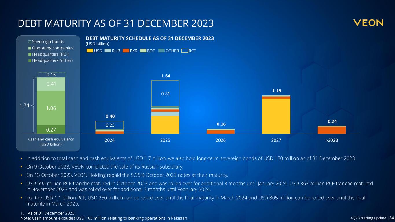 32 4Q23交易更新| 32 4Q23债务和流动性更新现金•现金总额17亿美元,其中截至2023年12月31日总部一级为13亿美元。•除17亿美元外,截至2023年12月31日,我们还持有1.5亿美元的长期主权债券。•运营仍为自筹资金。债务• 2023年10月13日,VEON Holding到期偿还5.95%的2023年10月票据。•退出俄罗斯并支付2023年和2024年票据后,集团债务同比减少。•租赁负债9.85亿美元。近期主要动态• 2023年10月9日,VEON完成了对俄罗斯子公司的出售。• 标普全球和惠誉均给予VEON BB-的信用评级。美元,百万元2023年12月31日12月22日同比现金及现金等价物总额1,7373,039-42.9 %总债务,有4,6937,479-37.3 %资本化租赁98580921.7%净债务2,9554,461-33.8 %净债务不包括租赁1,9713,657-46.1 %杠杆1.84x 2.55x-杠杆不包括租赁1.42x 2.36x-