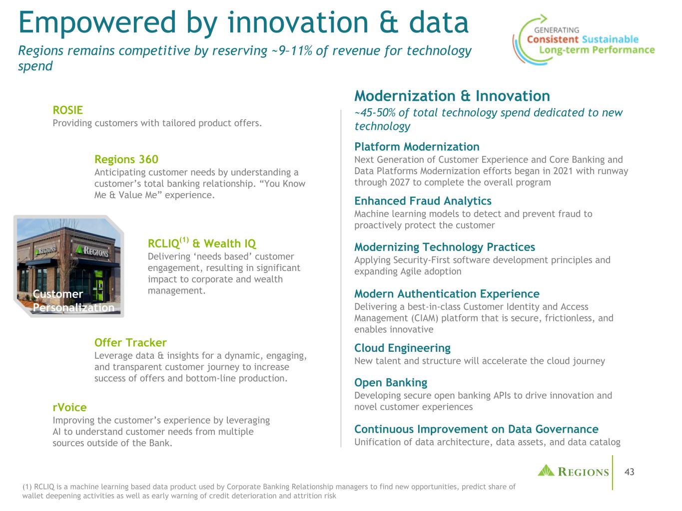 43创新和数据赋能各地区保持竞争力,将约9– 11%的收入用于技术支出(1)RCLIQ是一种基于机器学习的数据产品,企业银行关系经理使用它来发现新机会、预测钱包深化活动的份额以及预警信用恶化和损耗风险现代化和创新约占新技术支出总额的45-50 %客户个性化ROSIE为客户提供量身定制的产品。地区360通过了解客户的整体银行关系来预测客户需求。“You Know Me & Value Me”体验。RCLIQ(1)& Wealth IQ提供“基于需求”的客户参与,对企业和财富管理产生重大影响。Offer Tracker利用数据和洞察力,为客户提供一个动态、吸引人、透明的旅程,以提高产品和底线生产的成功率。rVoice通过利用人工智能了解来自银行以外多个来源的客户需求,改善客户体验。平台现代化下一代客户体验及核心银行和数据平台的现代化努力始于2021年,跑道将持续到2027年,以完成整体项目现代化技术实践应用安全优先的软件开发原则并扩大敏捷应用持续改进数据治理数据架构、数据资产和数据目录的统一现代认证体验提供一流的安全、无摩擦的客户身份和访问管理(CIAM)平台,并支持创新的增强欺诈分析机器学习模型检测和预防欺诈以主动保护客户开放银行开发安全的开放银行API以推动创新和新颖的客户体验云工程新的人才和结构将加速云之旅