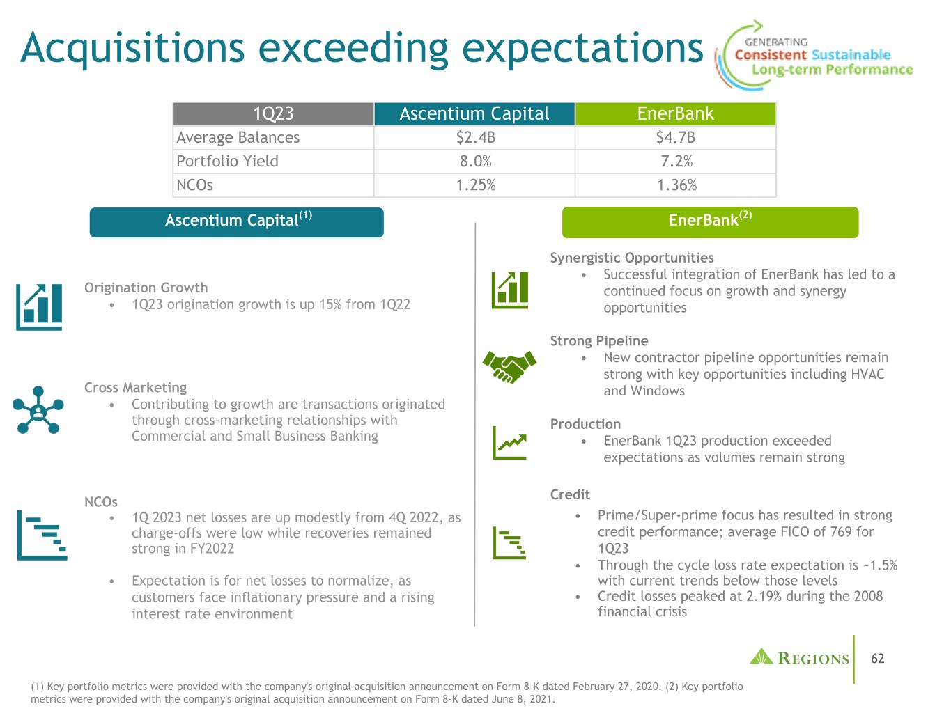62收购超出预期Ascentium Capital(1)EnerBank(2)发起增长• 1Q23发起增长较1Q22增长15% Cross Marketing推动增长的是通过与商业和小企业银行NCO的交叉营销关系发起的交易• 1Q2023净亏损较Q4略有上升,原因是冲销较低,而2022财年的复苏依然强劲•预计净亏损将正常化,随着客户面临通胀压力和利率上升的环境协同机会•成功整合EnerBank导致继续关注增长和协同机会强大的管道•新的承包商管道机会仍然强劲,包括暖通空调在内的关键机会和Windows Production • EnerBank23年第一季度的产量超出预期,因为产量仍然强劲。信贷• Prime/Super Prime的关注导致信贷表现强劲;23年第一季度平均FICO为769 •整个周期的损失率预期约为1.5%,而当前趋势低于这些水平•信贷损失在2008年金融危机期间达到2.19%的峰值(1)关键投资组合指标由公司2020年2月27日在表格8-K上的原始收购公告提供。(2)公司于2021年6月8日在表格8-K上发布的原始收购公告提供了关键的投资组合指标。1Q23 Ascentium Capital EnerBank Average Balances $ 2.4B $ 4.7B Portfolio Yield 8.0% 7.2% NCO 1.25% 1.36%