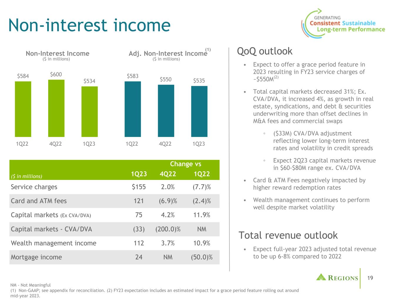 19 Adj. Non-Interest Income $ 583 $ 550 $ 535 1Q22 4Q22 1Q23 Change vs.($ in millions)1Q23 4Q22 1Q22 Service charges $ 1552.0%(7.7)%卡和ATM费121(6.9)%(2.4)%资本市场(Ex CVA/DVA)754.2% 11.9%资本市场-CVA/DVA(33)(200.0)% NM财富管理收入1123.7% 10.9%抵押贷款收入24 NM(50.0)% Non-Interest Income NM-Not Meaningful(1)Non-GAAP;调节见附录。(2)23财年预期包括对2023年年中前后推出的宽限期功能的估计影响。•预计2023年全年调整后总收入将比2022年环比增长6-8 %总收入前景•预计2023年将提供宽限期功能,导致23财年服务费约为5.5亿美元(2)•资本市场总额下降31%;CVA/DVA增长4%,原因是房地产、银团、债券和证券承销业务的增长抵消了并购费用和商业掉期交易的下降。(3300万美元)CVA/DVA调整反映了长期利率下降和信贷息差波动。CVA/DVA •卡和ATM费用受到较高的奖励兑换率的负面影响•尽管市场波动,财富管理仍然表现良好非利息收入$ 584 $ 600 $ 534 1Q22 4Q22 1Q23(百万美元)(百万美元)(1)