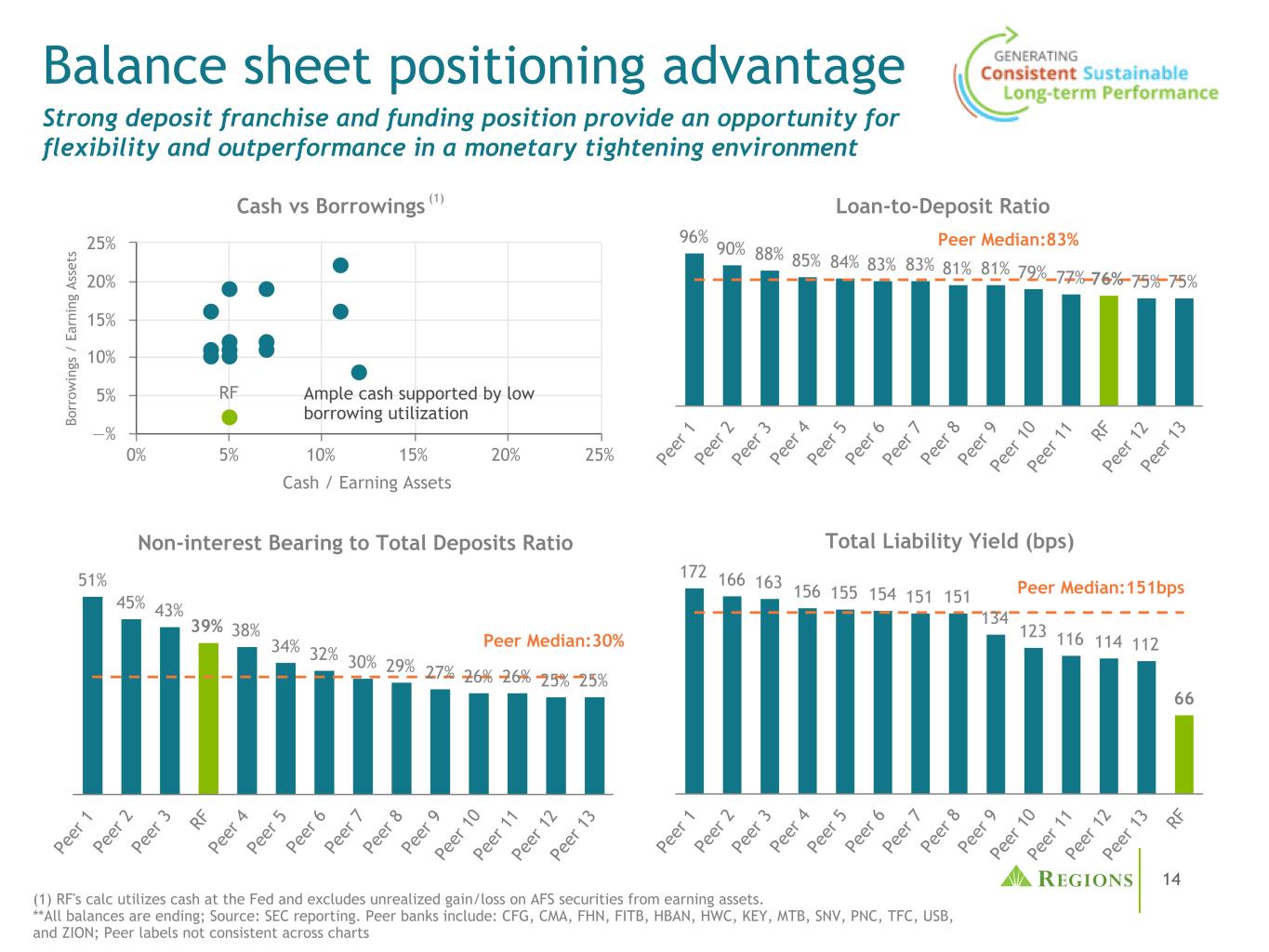 13浮动33%固定67%存款83%借款3%其他3%股票11% •资产负债表状况自然受益于利率上升(即对资产敏感),更大的浮动利率贷款和现金组合更大,多个利率周期所证明的稳定的存款基础•充足的现金和有限的批发借款用途将为有利可图的贷款增长和晚周期的存款流失提供资金•固定利率证券和固定收益对冲是隔离资产负债表中的自然利率敏感性所必需的①证券和对冲的未实现损失被较高利率环境下较高的存款价值所抵消超过IB 55% NIB 39% Time 6% Loans 64% Securities 19% Cash 4% Other 13% Floating 46% Fixed(ex Hedges)45% Fixed Hedges 9% $ 128B Loans(2)(3)(4)$ 98B Balance sheet profile(截至3月31日,2023)投资组合构成$ 154B资产(1)负债和权益$ 154B批发借款(2)$ 4B存款(1)证券包括AFS、未实现的AFS损失和HTM证券;现金是指在美联储持有的计息存款。(2)包括截至3/31/23的即期起始资产负债表套期保值;不包括远期起始衍生品。(3)ARM抵押贷款被列为浮动利率贷款。(4)浮动利率贷款的构成:LIBOR为15%,Prime为12%,SOFR为64%,BSBY为9%。(5)AOCI进行了调整,纳入了HTM证券的市值调整;同行包括:CFG、CMA、FHN、FITB、HWC、KEY、MTB、PNC、SNV、TFC、USB。(1.90)% Peer 1 Peer 2 Peer 3 Peer 4 Peer 5 Peer 6 Peer 7 Peer 8 Peer 9 RF Peer 10 Peer 11(5.00)%(2.50)% —% Adjusted(5)AOCI from AFS + HTM Securities & CF Hedges as % of Total Assets(As of 12/31/22)