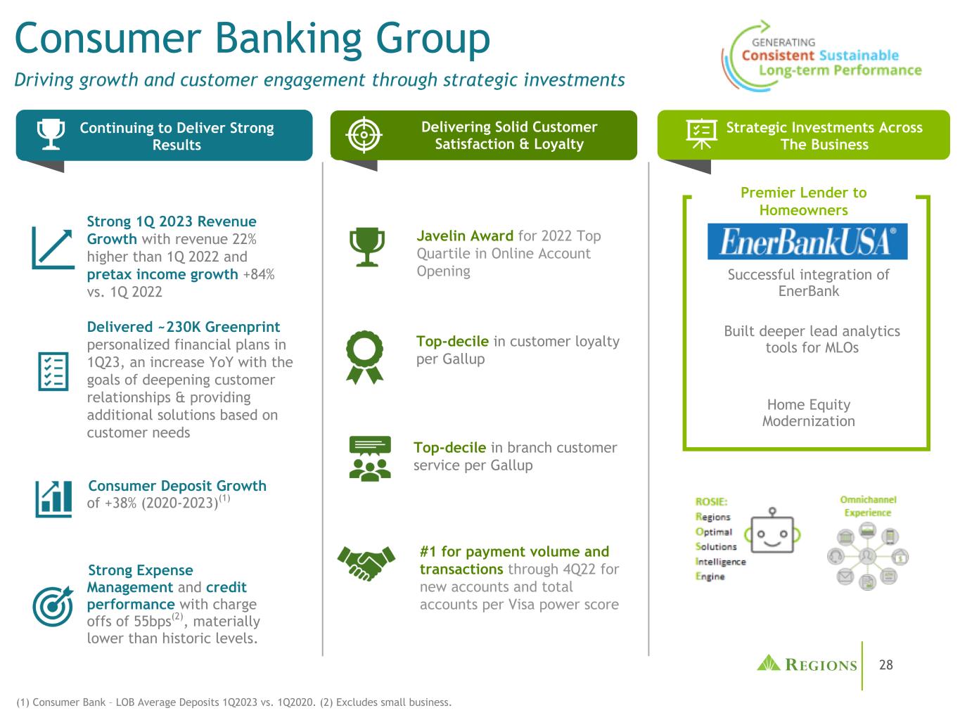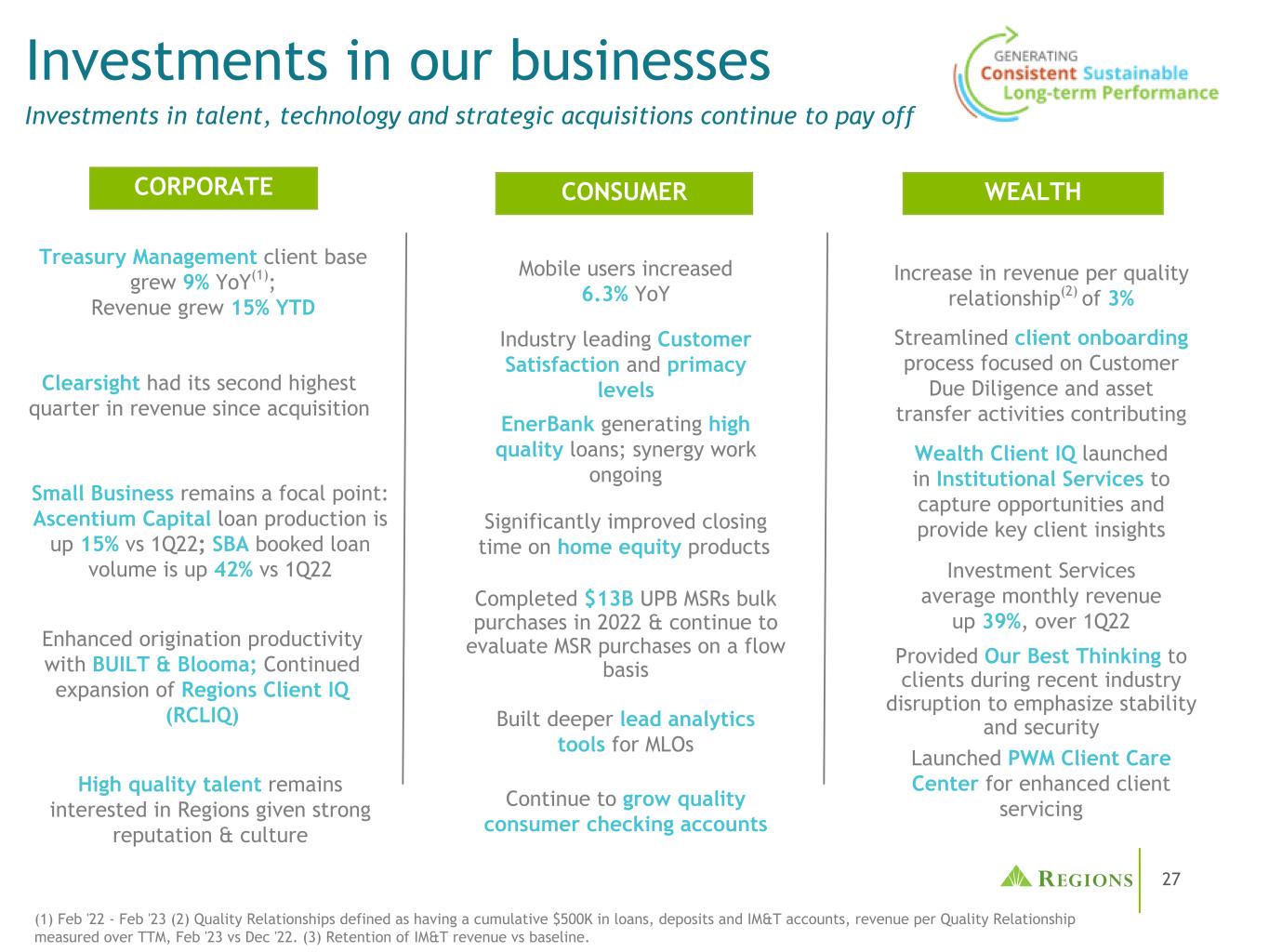 27(1)22年2月至23年2月(2)质量关系定义为在贷款、存款和即时通讯账户中累计拥有50万美元,按质量关系衡量的收入与TTM,22年2月至22年12月。(3)IM & T收入留存与基线对比。对我们企业的投资对人才的投资,技术和战略收购继续带来回报企业消费者财富移动用户同比增长6.3%每质量关系(2)收入增长3% Clearsight是自收购以来收入第二高的季度财富客户智商在机构服务中推出,以捕捉机会并提供关键的客户洞察力行业领先的客户满意度和首要水平在最近的行业动荡中为客户提供了我们的最佳思维,以强调稳定性与安全:2022年完成13B美元的UPB MSR大宗采购&继续在流量基础上评估MSR采购为MLO建立更深入的潜在客户分析工具EnerBank产生高质量贷款;协同工作正在进行中投资服务平均每月收入增长39%,2022年第一季度推出PWM客户服务中心,以增强客户服务简化客户入职流程,重点关注客户尽职调查资产转让活动对财资管理客户基础的贡献同比增长9%(1);年初至今收入增长15%房屋净值产品的结算时间显着改善高质量的人才仍然对地区感兴趣,因为拥有强大的声誉和文化通过BUILT & Blooma提高发起生产力;继续扩大地区客户智商(RCLIQ)小企业仍然是一个焦点:Ascentium Capital贷款产量较2022年第一季度增长15%;SBA入账贷款量较2022年第一季度增长42%继续增加高质量的消费者支票账户