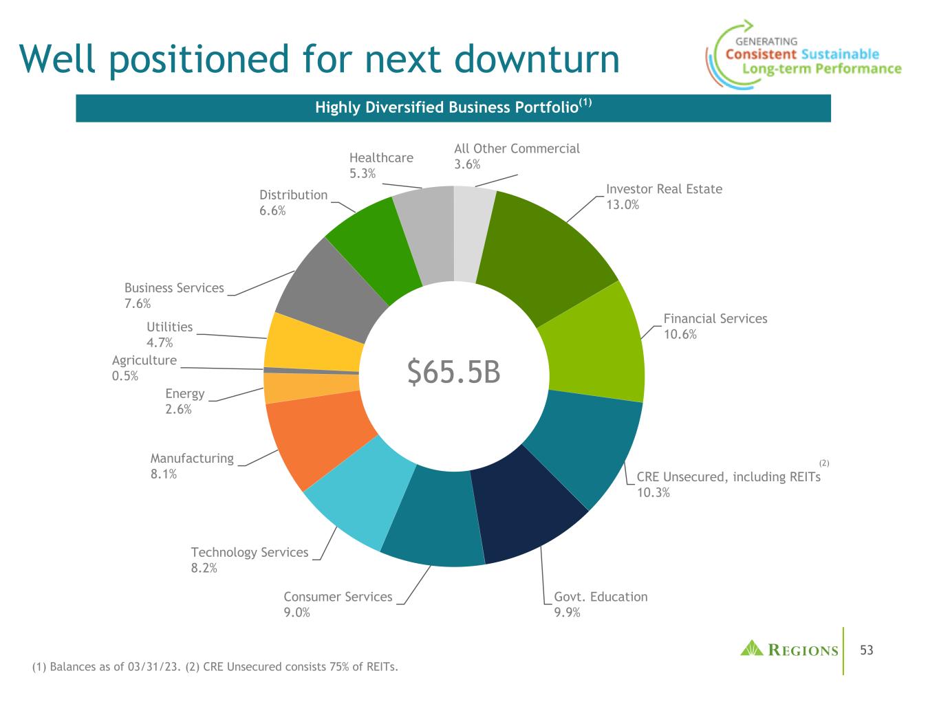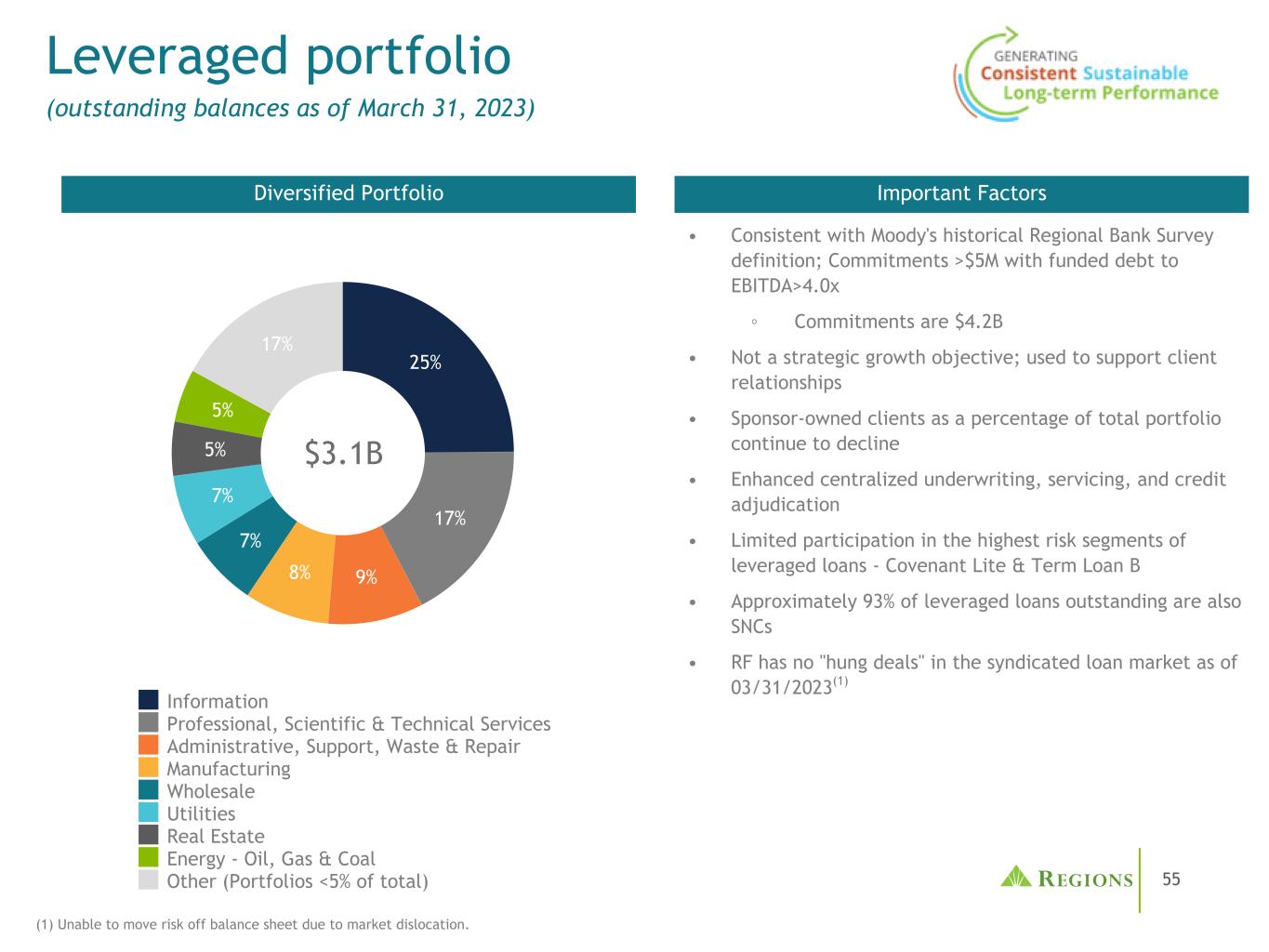 55 $ 3.1B杠杆投资组合(截至2023年3月31日的未清余额)•符合穆迪历史上的区域银行调查定义;承付款> 500万美元,融资债务与EBITDA之比> 4.0x ③承付款为$ 4.2B •不是战略增长目标;用于支持客户关系•赞助商拥有的客户在总投资组合中所占百分比继续下降•加强集中承保和服务,和信用裁决•有限参与杠杆贷款中风险最高的部分-Covenant Lite & Term Loan B •大约93%的未偿还杠杆贷款也是SNC •截至2023年3月31日,RF在银团贷款市场上没有“挂起的交易”(1)重要因素多元化投资组合25% 17% 9% 8% 7% 7% 5% 5% 17%信息专业、科学和技术服务行政、支持、废物和维修制造批发公用事业房地产能源-石油、天然气和煤炭其他(投资组合< 5%)(1)由于市场错位,无法将风险转移到资产负债表之外。