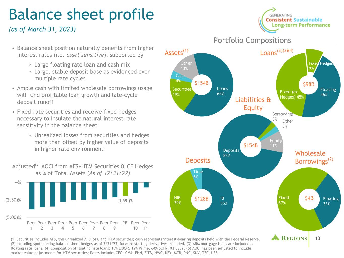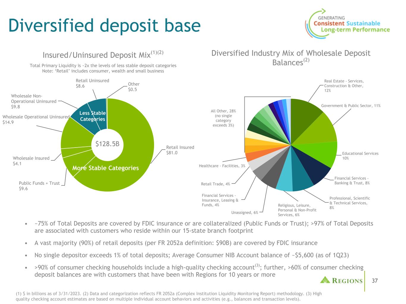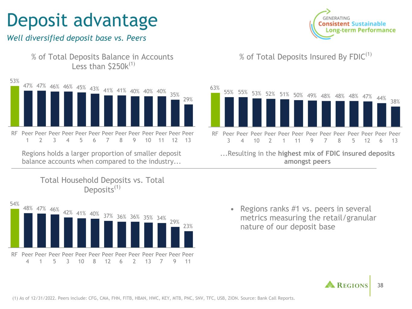37多样化存款基础(1)截至2023年3月31日,以十亿美元计。(2)数据和分类反映了FR2052a(复杂机构流动性监测报告)方法。(3)高质量的支票账户估计数是基于多种个人账户行为和活动(如余额和交易水平)。批发存款余额的多元化行业组合(2)主要流动性总额约为不太稳定的存款类别水平的2倍注:“零售”包括消费者、财富和小企业有保险/无保险存款组合(1)(2)房地产-服务、建筑和其他,12%政府和公共部门,11%教育服务10%金融服务-银行和信托,8%专业、科学和技术服务,8%宗教、休闲、个人和非营利服务,6%未分配,6%金融服务-保险、租赁和基金,4%零售贸易,4%医疗保健-设施,3%所有其他,28%(没有一个类别超过3%)•约75%的存款总额由FDIC保险覆盖或抵押(公共基金或信托);超过97%的存款总额与我们15个州分支机构内的客户相关•绝大多数(90%)的零售存款(根据FR 2052a定义:$ 90B)由FDIC保险覆盖•没有一个储户超过存款总额的1%;消费者NIB账户的平均余额约为5600美元(截至23年第一季度)•超过90%的消费者支票家庭拥有高质量的支票账户(3),> 60%的消费者支票存款余额来自在Regions服务10年或以上的客户Retail Insured $ 81.0 Public Funds + Trust $ 9.6 Wholesale Insured $ 4.1 Wholesale Operational Uninsured $ 14.9 Wholesale Non-Operational Uninsured $ 9.8 Retail Uninsured $ 8.6 Other $ 0.5 Less Stable Categories More Stable Categories $ 128.5B