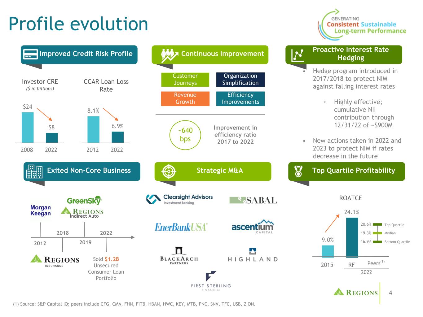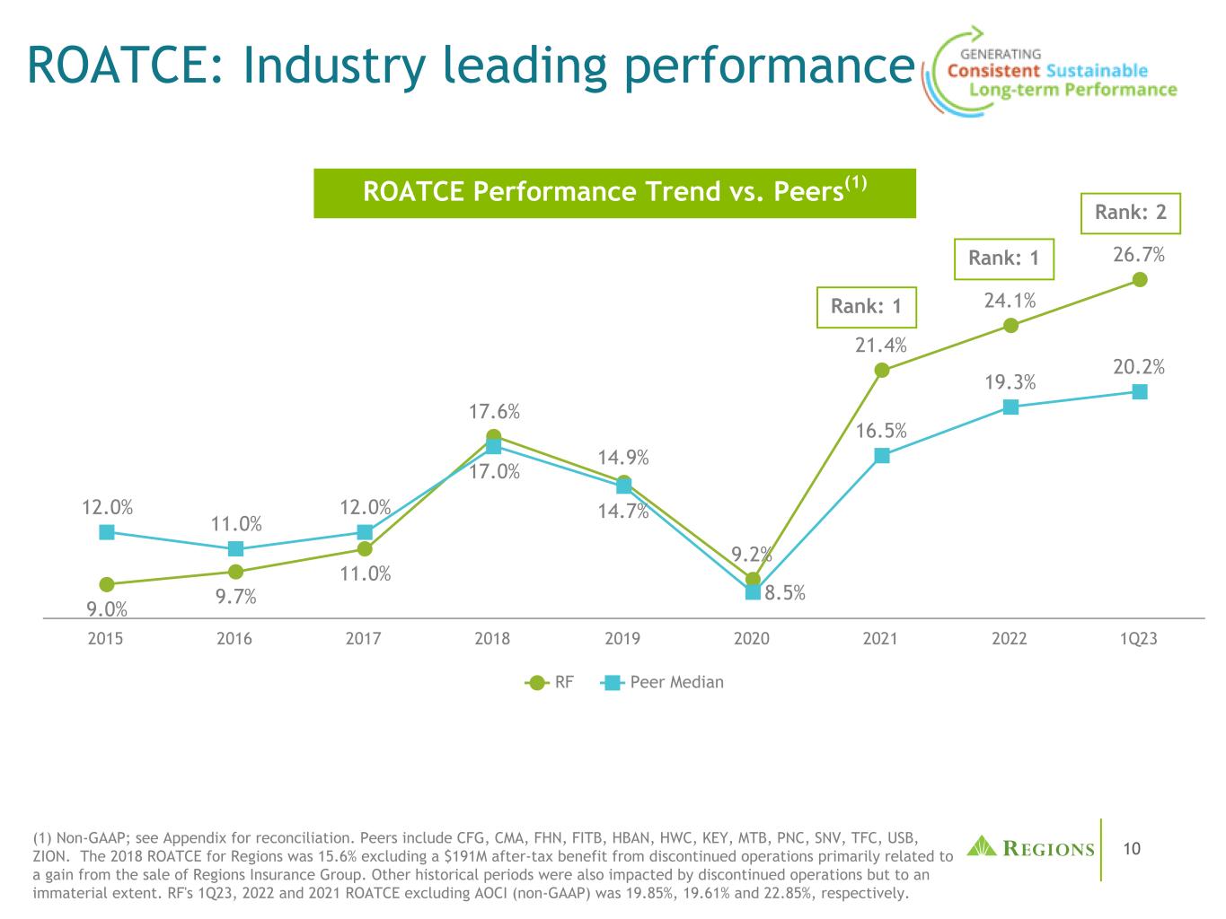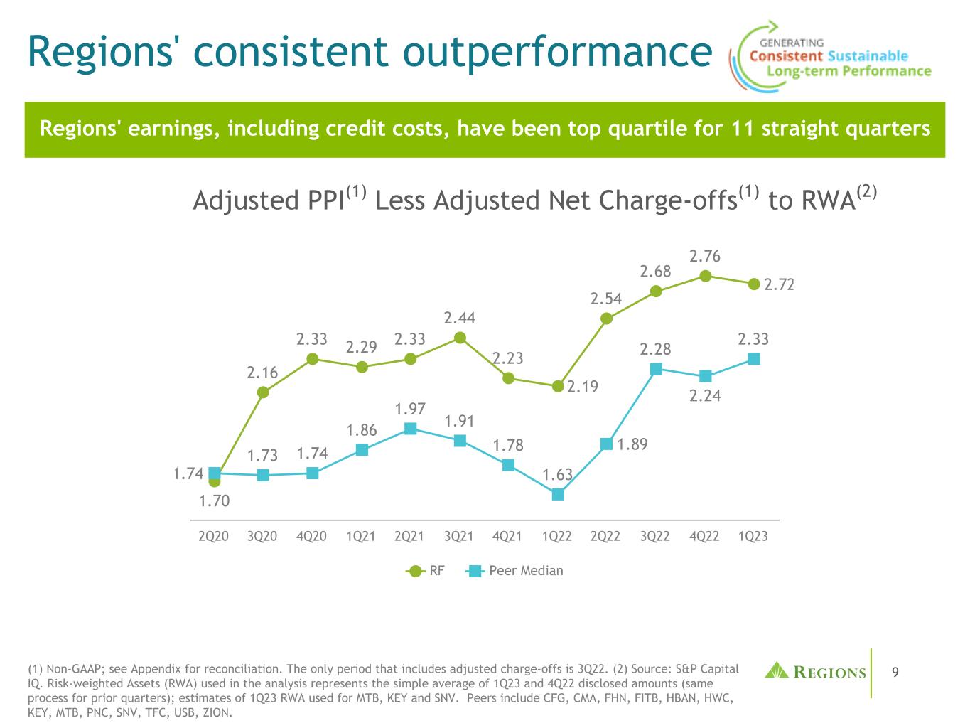 9个地区的表现持续优于调整后PPI(1)减去调整后净冲销(1)至风险加权资产(2)各地区的收益(包括信贷成本)连续11个季度处于前四位1.70 2.16 2.33 2.29 2.33 2.44 2.23 2.19 2.54 2.68 2.76 2.76 2.72 1.74 1.73 1.74 1.86 1.97 1.91 1.78 1.63 1.89 2.28 2.24 2.33射频同行中值2Q20 3Q20 4Q20 1Q21 2Q21 3Q21 1Q22 2Q22 3Q22 4Q22 1Q23(1)Non-GAAP;见附录的调节。唯一包含调整后冲销的时期是2022年第三季度。(2)资料来源:S & P Capital IQ。分析中使用的风险加权资产(RWA)是指23年第一季度和22年第四季度披露金额的简单平均值(前几个季度的过程相同);MTB、KEY和SNV使用的23年第一季度风险加权资产的估计值。同行包括CFG、CMA、FHN、FITB、HBAN、HWC、KEY、MTB、PNC、SNV、TFC、USB、ZION。