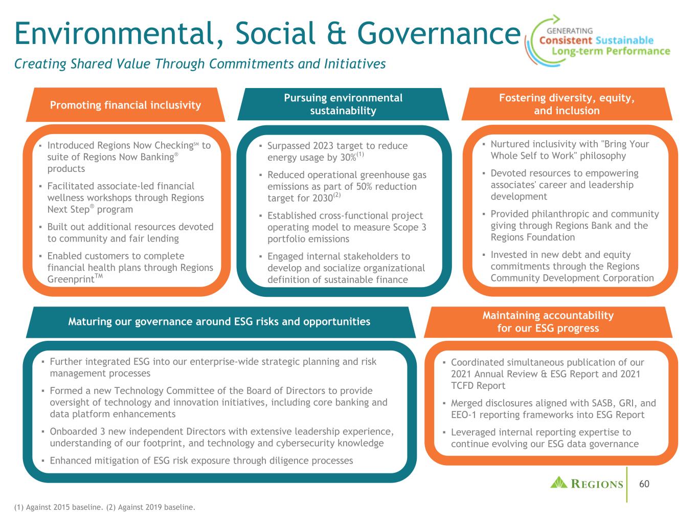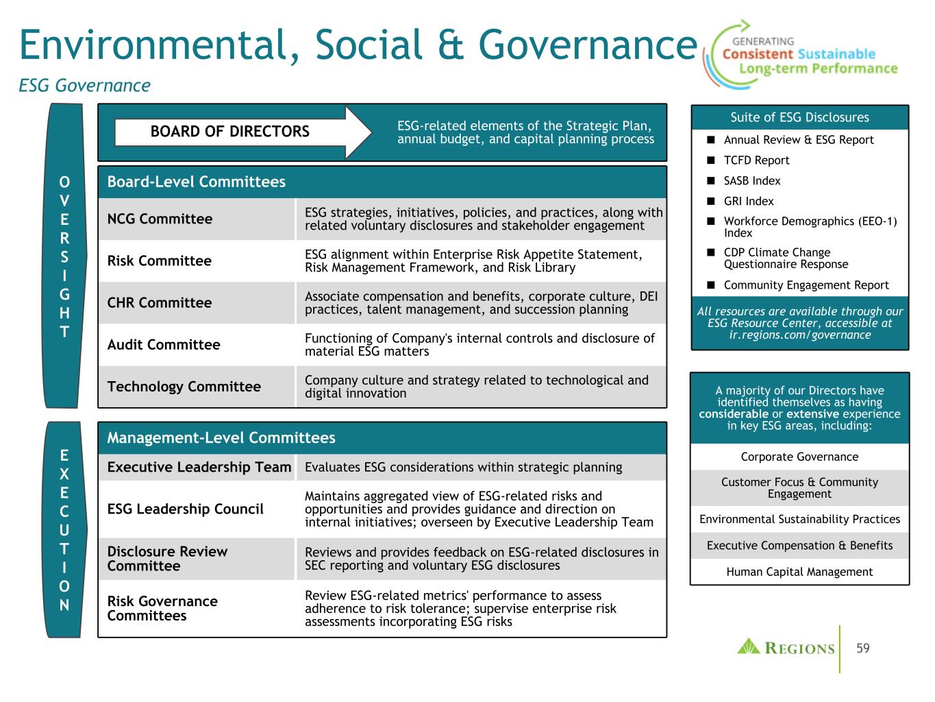 59战略计划、年度预算和资本规划流程中的环境、社会和治理ESG治理ESG相关要素董事会层面的委员会NCG委员会ESG战略、举措、政策和实践,以及相关的自愿披露和利益相关者参与风险委员会ESG在企业风险偏好声明、风险管理框架和风险图书馆CHR委员会协理薪酬和福利、企业文化、DEI实践、人才管理,和继任规划审计委员会公司内部控制的运作和重大ESG事项的披露技术委员会与技术和数字创新相关的公司文化和战略管理级别委员会执行领导团队评估战略规划中的ESG考虑因素ESG领导委员会维护ESG相关风险和机会的总体观点,并就内部举措提供指导和方向;由执行领导团队监督披露审查委员会审查并在SEC报告中就ESG相关披露提供反馈和自愿披露ESG风险治理委员会审查ESG相关指标的绩效,以评估遵守风险容忍度的情况;监督纳入ESG风险的企业风险评估OV E R S I G H T E X E C U T I O N我们的大多数董事都认为自己在关键ESG领域拥有丰富或丰富的经验,包括:公司治理客户关注和社区参与环境可持续性实践高管薪酬和福利人力资本管理ESG披露套件■年度审查和ESG报告■ TCFD报告■ SASB指数■ GRI指数■劳动力人口(EEO-1)指数■ CDP气候变化调查问卷回应■社区参与报告所有资源均可通过我们的ESG资源中心获得,可访问ir.regions.com/governance