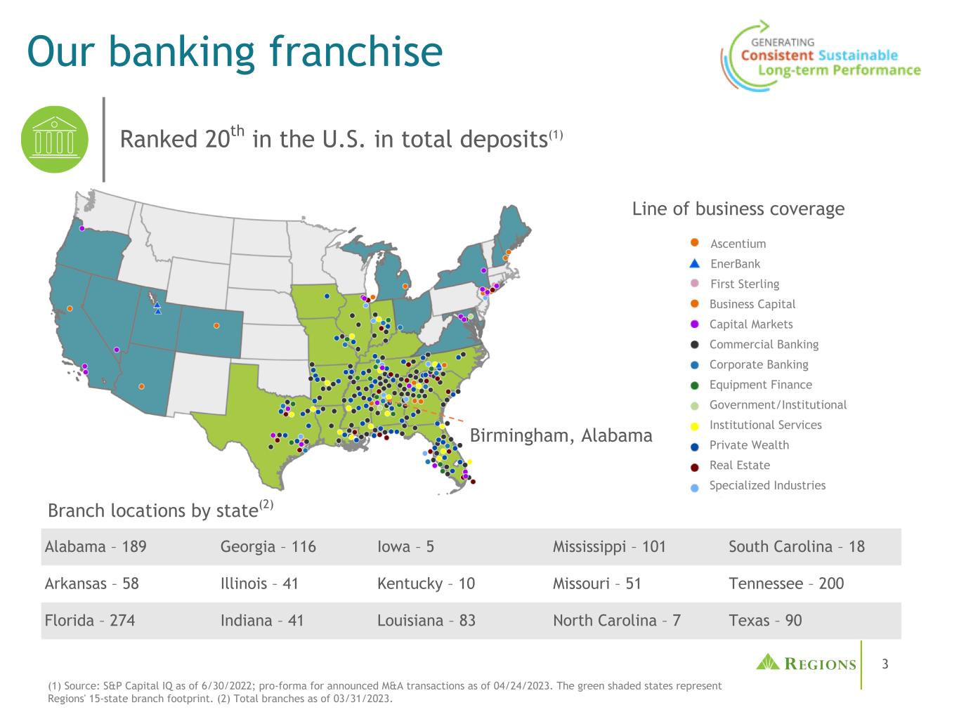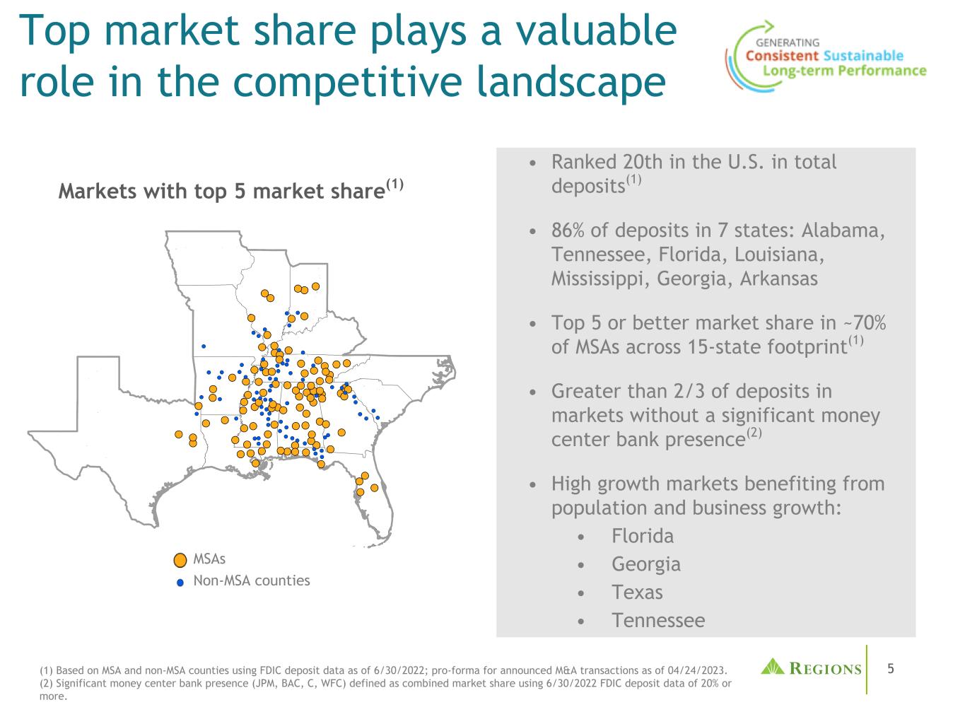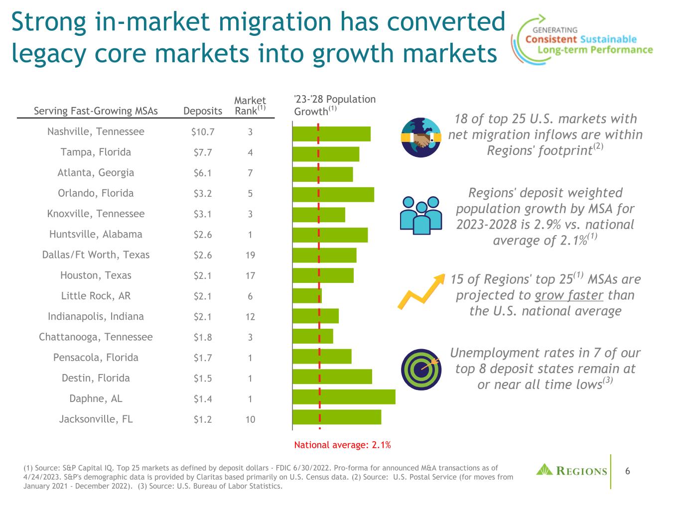5最大的市场份额在竞争格局中发挥着重要作用(1)基于MSA和非MSA县使用截至2022年6月30日的FDIC存款数据;截至2023年4月24日已宣布的并购交易的预估数据。(2)重要的货币中心银行存在(JPM、BAC、C、WFC)定义为使用6/30/2022 FDIC存款数据的合并市场份额达到或超过20%。拥有前5大市场份额的市场(1)MSA非MSA县•存款总额在美国排名第20(1)•在7个州拥有86%的存款:阿拉巴马、田纳西、佛罗里达、路易斯安那、密西西比、乔治亚、阿肯色•在15个州的约70%的MSA中拥有前5大或更高的市场份额(1)•在没有大型货币中心银行存在的市场拥有超过2/3的存款(2)•受益于人口和业务增长的高增长市场:•佛罗里达•乔治亚•德克萨斯•田纳西