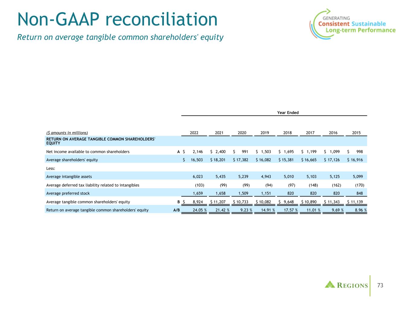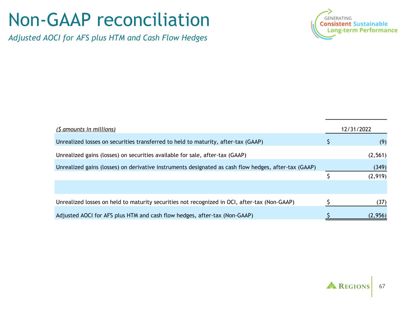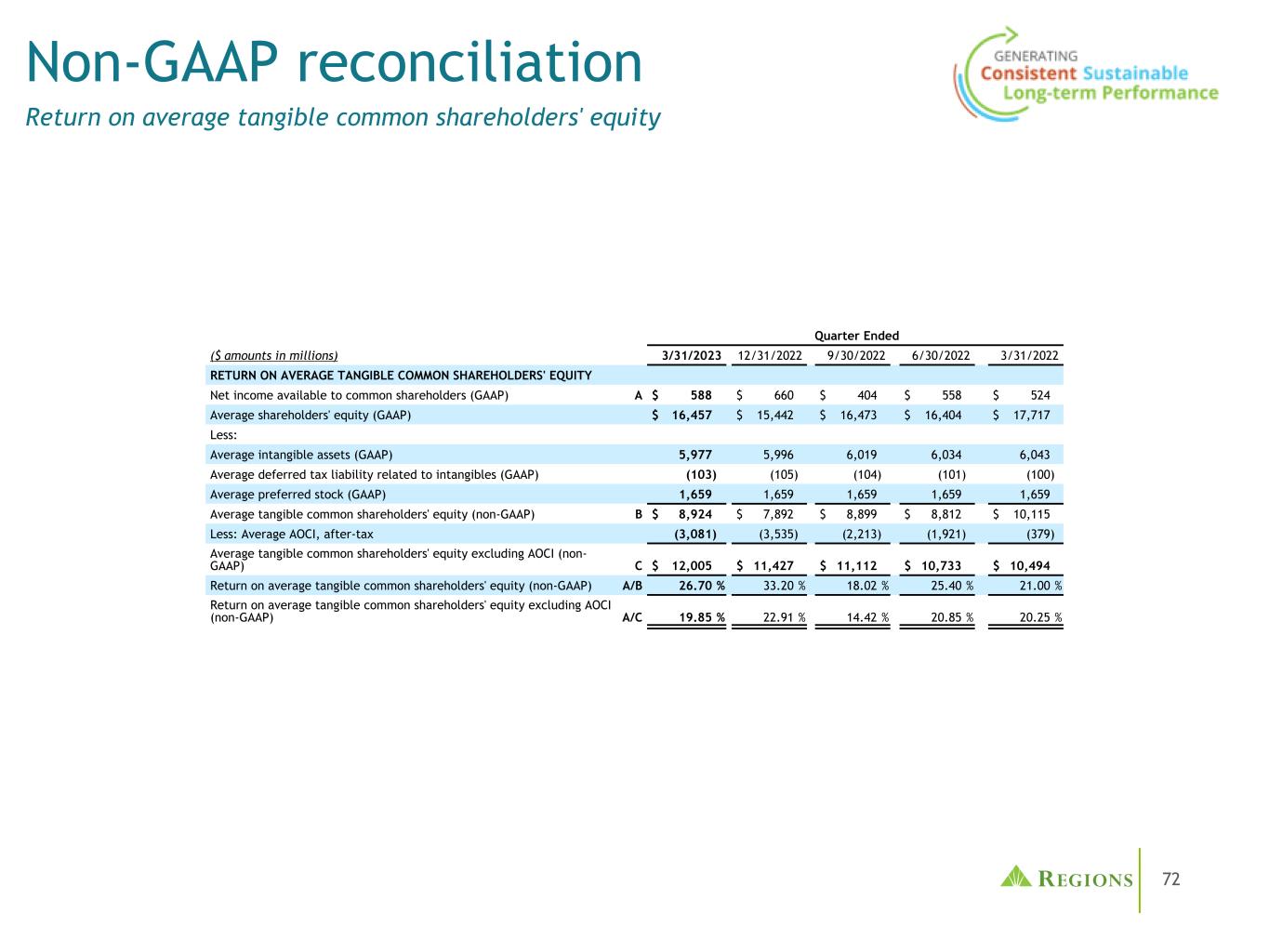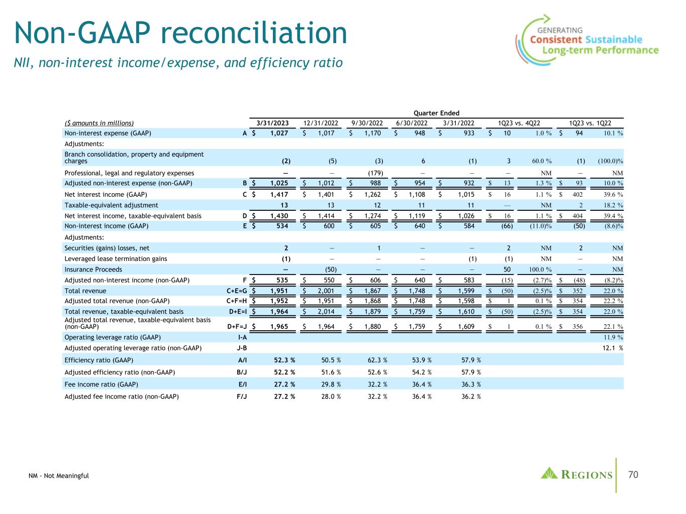 65管理层使用税前拨备前收入(non-GAAP)和调整后的税前拨备前收入(non-GAAP),以及调整后的效率比率(non-GAAP)和调整后的费用收入比率(non-GAAP)来监测业绩,并认为这些指标为投资者提供了有意义的信息。非利息费用(GAAP)不包括某些调整,以得出调整后的非利息费用(non-GAAP),这是效率比率的分子。非利息收入(GAAP)不包括某些调整,以得出调整后的非利息收入(non-GAAP),这是手续费收入比率的分子。调整后的非利息收入(non-GAAP)和调整后的非利息费用(non-GAAP)用于确定调整后的税前拨备前收入(non-GAAP)。按应税等值计算的净利息收入(GAAP)和非利息收入相加,得出按应税等值计算的总收入。调整是为了在应税等值基础上(非公认会计原则)得出调整后的总收入,这是收费收入和效率比率的分母。净贷款冲销(GAAP)不包括调整,以得出调整后的净贷款冲销(非GAAP)。调整后的净贷款冲销占平均贷款的百分比(非公认会计原则)计算为调整后的净贷款冲销(非公认会计原则)除以平均贷款(公认会计原则)并按年计算。Regions认为,排除这些调整为期间比较提供了一个有意义的基础,管理层认为这将有助于投资者分析公司的经营业绩和预测未来的业绩。这些非GAAP财务指标也被管理层用来评估Regions的业务表现。与调整有关的活动有可能再次发生;但是,管理当局并不认为与调整有关的活动表明正在进行的业务。Regions认为,这些非公认会计原则财务指标的列报将使投资者能够在管理层采用的相同基础上评估公司的业绩。有形普通股股东权益和平均有形普通股股东权益回报率(ROATCE)已成为一些投资者关注的焦点,管理层认为,在不考虑无形资产和优先股影响的情况下,这可能有助于投资者分析公司的资本状况。分析师和银行业监管机构使用有形普通股股东权益衡量标准来评估各地区的资本充足率。由于有形普通股股东权益和ROATCE不是由GAAP正式定义的,也不是由联邦银行业监管规定的任何金额,因此它们目前被视为非GAAP财务指标,其他实体的计算方法可能与地区披露的计算方法不同。股东权益的调整包括无形资产和相关的递延税款和优先股。此外,对ROATCE的调整还包括累计的其他综合收入。由于分析师和银行业监管机构可能会使用有形普通股股东权益来评估各地区的资本充足率,因此管理层认为,让投资者能够在同样的基础上评估各地区的资本充足率是有益的。非公认会计原则的财务措施有其固有的局限性,不需要统一适用,也不需要经过审计。虽然这些非GAAP财务指标经常被利益相关者用于评估公司,但它们作为分析工具存在局限性,不应孤立地考虑,也不应替代根据GAAP报告的结果分析。特别是,不包括选定项目的收益衡量标准并不代表实际上直接给股东带来的金额。管理部门和董事会采用以下非公认会计原则措施:•编制各区域的业务预算•月度财务执行情况报告•合并结果的月度结账报告(仅限管理部门)•向投资者介绍公司业绩•奖励薪酬指标非公认会计原则信息