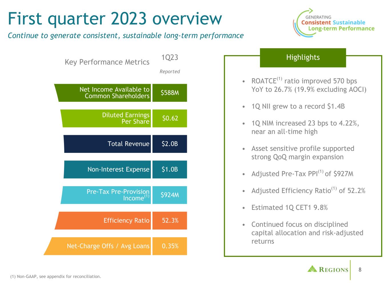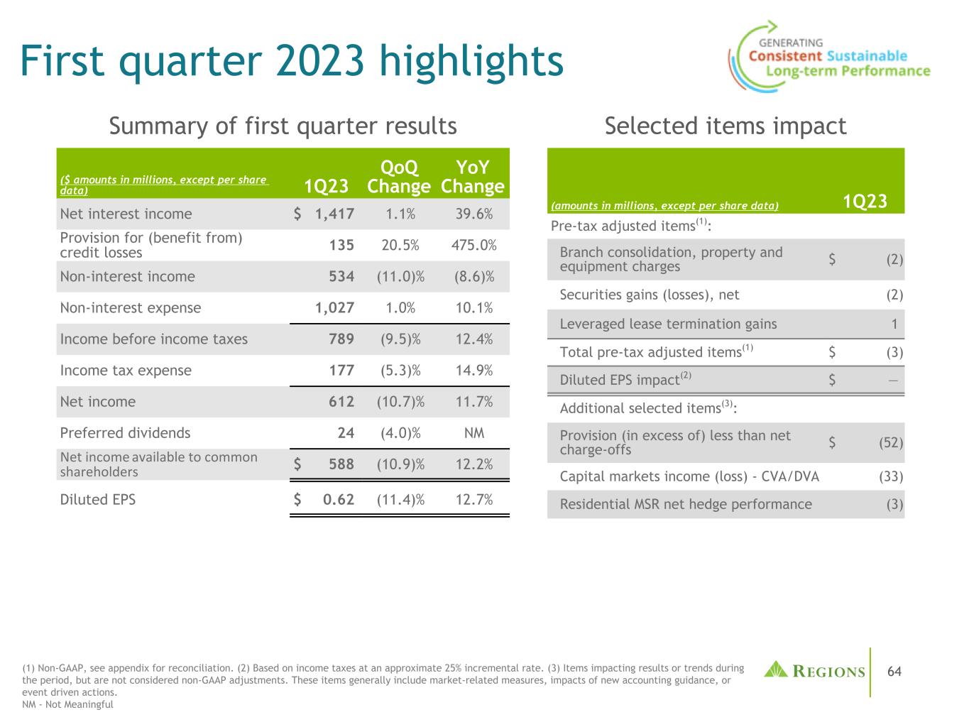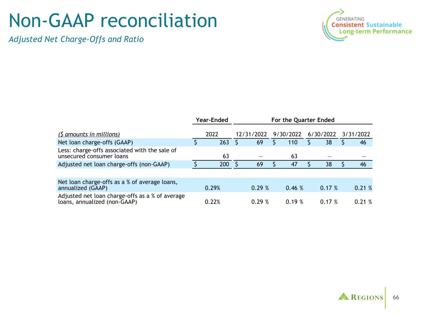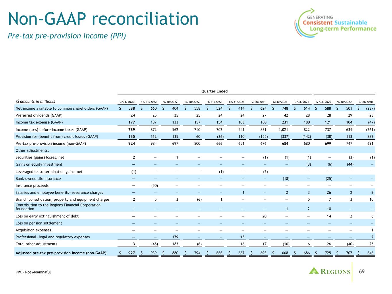 65管理层使用税前拨备前收入(non-GAAP)和调整后的税前拨备前收入(non-GAAP),以及调整后的效率比率(non-GAAP)和调整后的费用收入比率(non-GAAP)来监测业绩,并认为这些指标为投资者提供了有意义的信息。非利息费用(GAAP)不包括某些调整,以得出调整后的非利息费用(non-GAAP),这是效率比率的分子。非利息收入(GAAP)不包括某些调整,以得出调整后的非利息收入(non-GAAP),这是手续费收入比率的分子。调整后的非利息收入(non-GAAP)和调整后的非利息费用(non-GAAP)用于确定调整后的税前拨备前收入(non-GAAP)。按应税等值计算的净利息收入(GAAP)和非利息收入相加,得出按应税等值计算的总收入。调整是为了在应税等值基础上(非公认会计原则)得出调整后的总收入,这是收费收入和效率比率的分母。净贷款冲销(GAAP)不包括调整,以得出调整后的净贷款冲销(非GAAP)。调整后的净贷款冲销占平均贷款的百分比(非公认会计原则)计算为调整后的净贷款冲销(非公认会计原则)除以平均贷款(公认会计原则)并按年计算。Regions认为,排除这些调整为期间比较提供了一个有意义的基础,管理层认为这将有助于投资者分析公司的经营业绩和预测未来的业绩。这些非GAAP财务指标也被管理层用来评估Regions的业务表现。与调整有关的活动有可能再次发生;但是,管理当局并不认为与调整有关的活动表明正在进行的业务。Regions认为,这些非公认会计原则财务指标的列报将使投资者能够在管理层采用的相同基础上评估公司的业绩。有形普通股股东权益和平均有形普通股股东权益回报率(ROATCE)已成为一些投资者关注的焦点,管理层认为,在不考虑无形资产和优先股影响的情况下,这可能有助于投资者分析公司的资本状况。分析师和银行业监管机构使用有形普通股股东权益衡量标准来评估各地区的资本充足率。由于有形普通股股东权益和ROATCE不是由GAAP正式定义的,也不是由联邦银行业监管规定的任何金额,因此它们目前被视为非GAAP财务指标,其他实体的计算方法可能与地区披露的计算方法不同。股东权益的调整包括无形资产和相关的递延税款和优先股。此外,对ROATCE的调整还包括累计的其他综合收入。由于分析师和银行业监管机构可能会使用有形普通股股东权益来评估各地区的资本充足率,因此管理层认为,让投资者能够在同样的基础上评估各地区的资本充足率是有益的。非公认会计原则的财务措施有其固有的局限性,不需要统一适用,也不需要经过审计。虽然这些非GAAP财务指标经常被利益相关者用于评估公司,但它们作为分析工具存在局限性,不应孤立地考虑,也不应替代根据GAAP报告的结果分析。特别是,不包括选定项目的收益衡量标准并不代表实际上直接给股东带来的金额。管理部门和董事会采用以下非公认会计原则措施:•编制各区域的业务预算•月度财务执行情况报告•合并结果的月度结账报告(仅限管理部门)•向投资者介绍公司业绩•奖励薪酬指标非公认会计原则信息