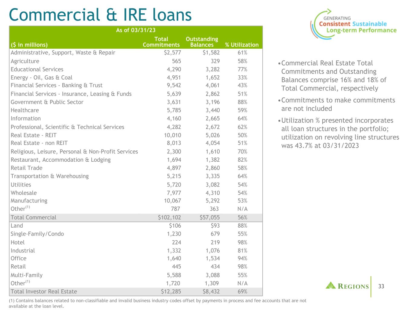 33商业和IRE贷款截至23年3月31日(百万美元)总承诺未偿余额%利用行政、支持、废物和维修2,577美元1,58261%农业56532958%教育服务4,2903,28277%能源-石油、天然气和煤炭4,9511,65233%金融服务-银行和信托9,5424,06143%金融服务-保险、租赁和基金5,6392,86251%政府和公共部门3,6313,19688%医疗保健5,7853,44059%信息4,1602,66564%专业,科技服务4,2822,67262%房地产-房地产投资信托基金10,0105,02650%房地产-非房地产投资信托基金8,0 134,05451%宗教、休闲、个人及非营利服务2,3001,61070%餐厅,Accommodation & Lodging 1,6941,38282% Retail Trade 4,8972,86058% Transportation & Warehousing 5,2153,33564% Utilities 5,7203,08254% Wholesale 7,9774,31054% Manufacturing 10,0675,29253% Other(1)787363 N/A Total Commercial $ 102 $ 57,05556% Land $ 106 $ 9388% Single-Family/Condo 1,23067955% Hotel 22421998% Industrial 1,3321,07681% Office 1,6401,53494% Retail 44543498% Multi-Family 5,5883,08855% Other(1)1,7201,分别•不包括承付款项•所列利用率包括组合中的所有贷款结构;截至2023年3月31日,循环项目结构的利用率为43.7%(1)包括与不可分类和无效的商业行业代码有关的余额,这些余额被贷款一级无法获得的过程中付款和费用账户抵消。