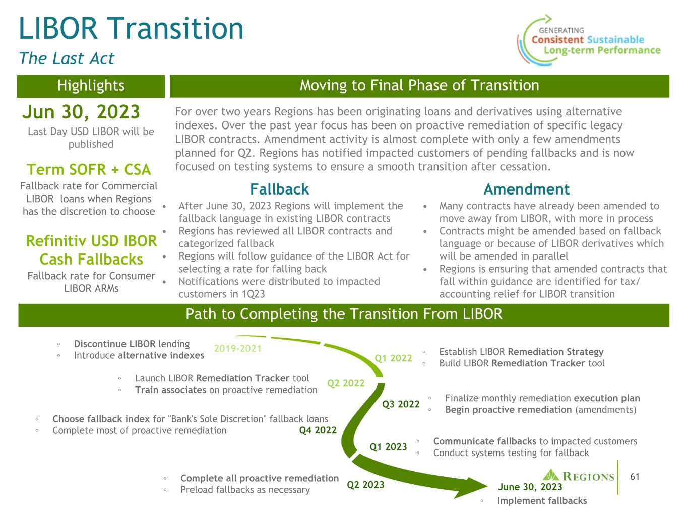 61伦敦银行间同业拆借利率过渡进入过渡最后阶段的最后一幕完成从伦敦银行间同业拆借利率过渡的路径两年多来,各地区一直在利用替代指数发放贷款和衍生品。过去一年的重点一直是积极主动地对特定的遗留LIBOR合约进行补救。修正活动几乎已经完成,第二季度只有几项修正计划。各地区已通知受影响的客户即将出现的退路,目前正专注于测试系统,以确保停止后的平稳过渡。摘要2023年6月30日最后一天美元LIBOR将公布期限SOFR + CSA商业LIBOR贷款的回退率,当各地区有权自行选择回退修正时• 2023年6月30日后各地区将在现有LIBOR合约中实施回退语言•各地区已审查所有LIBOR合约并分类回退•各地区将遵循LIBOR法案的指导选择回退率•通知已于23年第一季度分发给受影响的客户•许多合约已被修正,以摆脱LIBOR,有更多正在进行中•可能会根据后备语言或由于LIBOR衍生工具而修订合同,而LIBOR衍生工具将同时修订•各区域正在确保修订合同在指导范围内的,将被确定为LIBOR过渡的税收/会计减免83.9停止LIBOR贷款93.9引入替代指数93.9启动LIBOR补救跟踪工具93.9对员工进行主动补救培训93.9完成大部分主动补救83.9完成所有主动补救83.9完成所有主动补救83.9根据需要预装后备83.9建立LIBOR补救战略93.9建立LIBOR补救跟踪工具93.9最终确定每月补救执行计划93.9开始主动补救(修正)93.9向受影响的客户传达后备数据93.9进行系统测试for fallback ③ Implement fallbacks 2019-2021 Q2 2022 Q1 2022 Q3 2022 Q4 2022 Q1 2023 Q2 2023 June 30,2023 Refinitiv USD IBOR Cash Fallbacks Fallback rate for Consumer LIBOR ARM