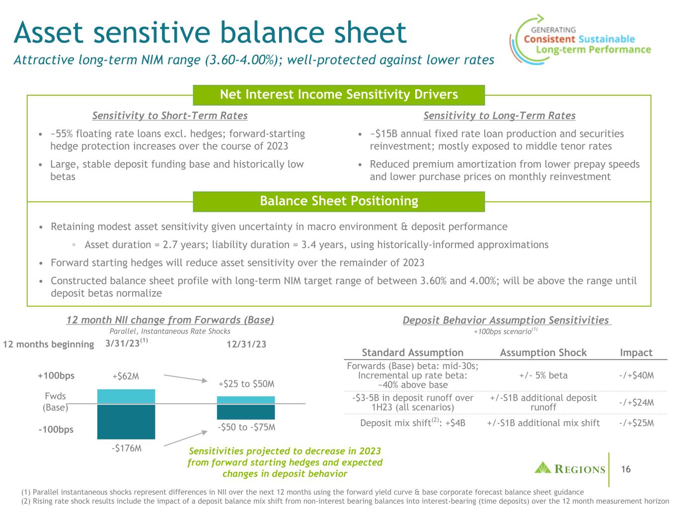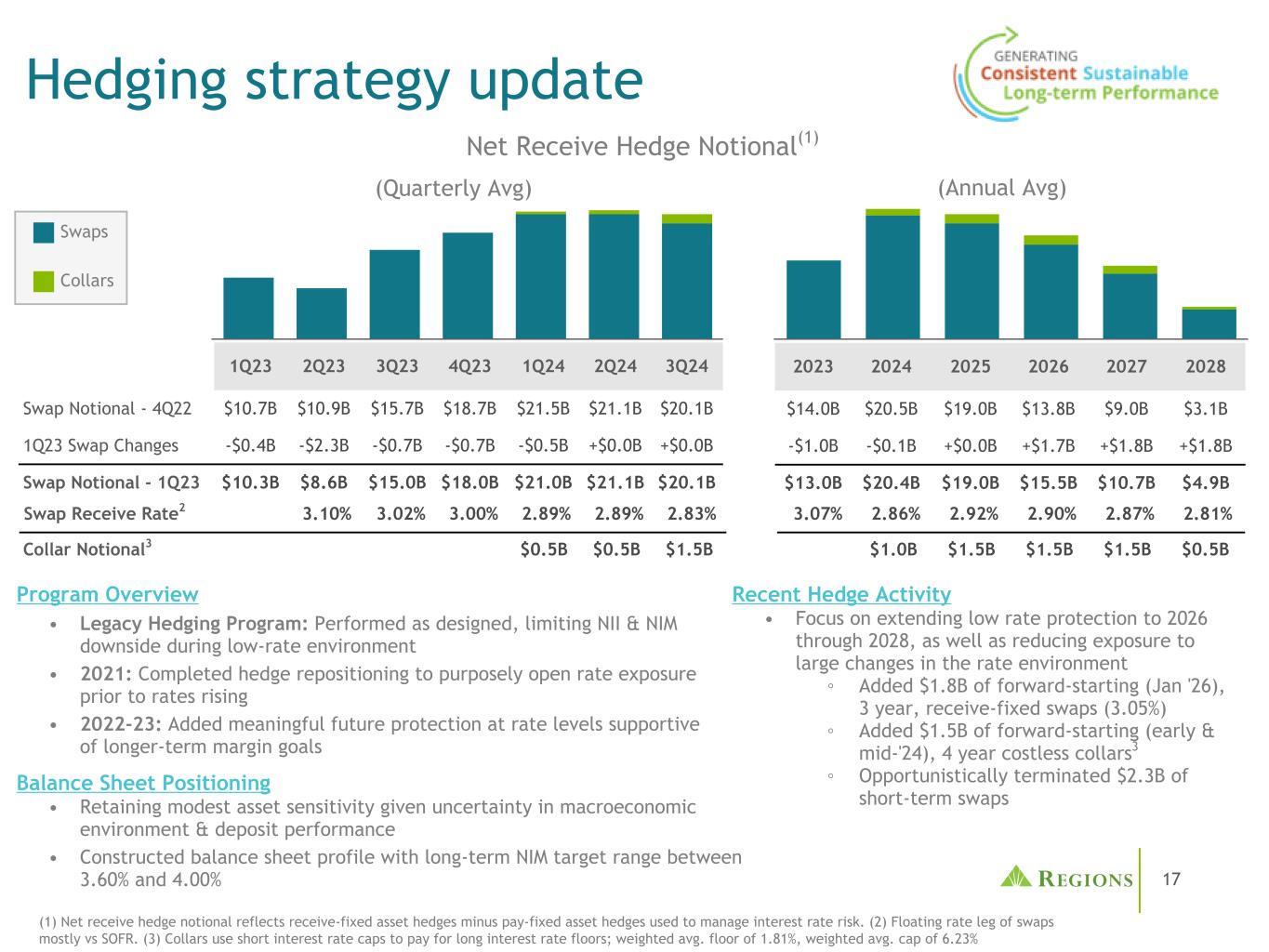 171234567计划概述•遗留对冲计划:按设计执行,在低利率环境下限制NII和NIM下行空间• 2021年:完成对冲重新定位,在利率上升之前故意打开利率敞口• 2022-23年:在支持较长期保证金目标的利率水平上增加有意义的未来保护净收益对冲名义(1)(1)净收益对冲名义反映收到-固定资产对冲减去用于管理利率风险的支付-固定资产对冲。(2)互换的浮动利率部分主要是相对于SOFR。(3)领头使用短期利率上限支付长期利率下限;加权平均下限为1.81%,加权平均上限为6.23%对冲策略更新(季度平均)123456202320242025202620272028 $ 14.0B $ 20.5B $ 19.0B $ 13.8B $ 9.0B $ 3.1B-$ 1.0B-$ 0.1B + $ 0.0B + $ 1.7B + $ 1.8B + $ 1.8B $ 13.0B $ 20.4B $ 19.0B $ 15.5B $ 10.7B $ 4.9B 3.07% 2.86% 2.92% 2.90% 2.87% 2.81%(年度平均)近期对冲活动•关注将低利率保护延长至2026年至2028年,以及降低利率环境中的大幅变动带来的风险敞口③增加了1.8B美元的远期起始期(1月26日),3年期,固定收益互换(3.05%)③增加了1.5B美元的远期起始期(24年初和中期),4年期无成本项圈3 ③ Opportunistically terminated $ 2.3B of short-term swaps 1Q23 2Q23 3Q23 4Q23 1Q24 2Q24 3Q24 Swap Notional-4Q22 $ 10.7B $ 10.9B $ 15.7B $ 18.7B $ 21.5B $ 21.1B $ 20.1B 1Q23 Swap Changes-$ 0.4B-$ 2.3B-$ 0.7B-$ 0.7B-$ 0.5B + $ 0.0B + $ 0.0B Swap Notional-1Q23 $ 10.3B $ 8.6B $ 15.0B $ 18.0B $ 21.0B $ 21.1B $ 20.1B Swap Swap Receive Rate2 3.10% 3.02% 3.00% 2.89% 2.89% 2.83% Balance Sheet Positioning • Retaining modest asset sens和4.00% $ 1.0B $ 1.5B $ 1.5B $ 1.5B $ 0.5BCollar Notional3 $ 0.5B $ 0.5B $ 1.5B Collars