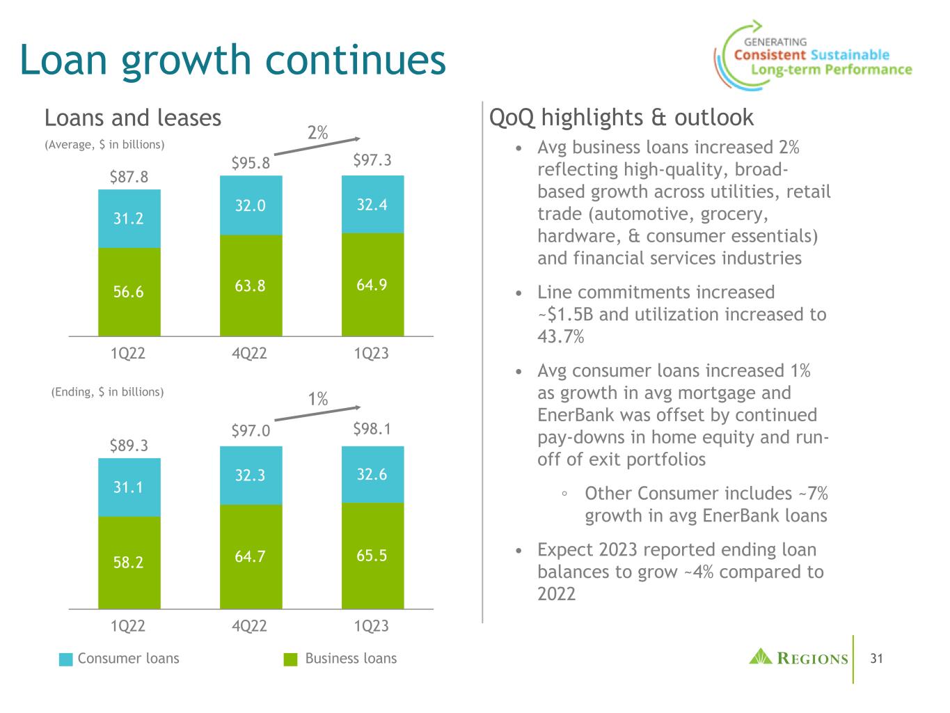 30(1)代表3月QTD数字。(2)财富管理-LOB平均存款1Q20 vs 1Q23财富管理集团专注于执行和投资以优化客户和员工体验在最近的行业新闻中,通过多个客户体验接触点为客户提供了我们的最佳思维,通过与个人银行和企业银行业务的持续合作和稳固的合作关系,客户体验和沟通势头在所有市场都得到了提升,季度净息差达到创纪录的1090万美元,同比增长10.7%,这得益于强劲的投资服务费收入和投资信息技术制作及货币市场共同基金费用取得了创纪录的业绩(1)战略技术投资和数据分析超过了客户留存目标,通过Wealth IQ为PWM客户带来了额外收入,Next Best Credit Solution也通过投资信息技术销售推动了收入增长,管理资产同比增长1.7%审慎的投资组合管理缓解市场逆风赛富时现代化增强了CRM功能,为增长奠定了基础,并推动了多个维度的价值投资区域财富平台,资产管理应用程序的额外增强平均存款下降(5.1%)(2020-2023年)(2),部分原因是PWM客户寻求收益客户通信每周市场评论点击率增加,展示次数超过13.8万次。上个季度,社交媒体渠道出现了新的WM领英粉丝激增和新帖子增多的现象。在第一季度数字营销活动的推动下,Regions.com WM登录页面的新访问者增长了40%。继续采用Wealth Client IQ for Institutional Trust来确定目标收入机会在整个财富管理中重新启用品牌标识,以提高对Wealth的解决方案、服务和专业知识的认识并使其与众不同继续关注自动化工作,以提高运营效率、降低风险和增强客户体验,即:实施自动警报加强引导式发现,将其转至Wealth进行基于需求的对话,以解决客户的投资、退休和规划目标启动PWM客户服务中心,以加强客户服务