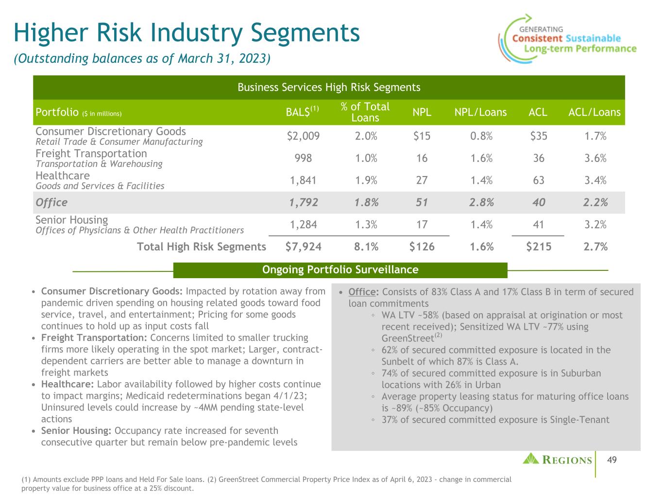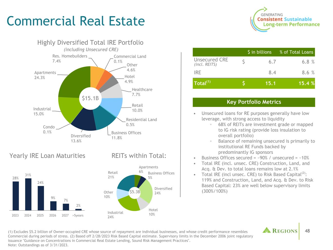 48商业地产高度多样化的总IRE投资组合(包括无担保CRE)•用于可再生能源用途的无担保贷款通常具有较低的杠杆,能够很好地获得流动性。↓68%的REIT是投资级或符合IG风险评级(为整个投资组合提供绝缘损失)的资产余额主要是由主要由IG发起人支持的机构RE基金•有担保的商业办公室=~90%/无担保=~10% •总IRE(包括unsec.)。CRE)建筑、土地和收购。与贷款总额之比仍然很低,为2.1% •总内部收益率(包括unsec。CRE)对风险资本(2):119%和建筑、土地和收购。& Dev. to Risk Based Capital:23%远低于监管限制(300%/100%)(1)不包括52亿美元的业主自用CRE,其还款来源是个体企业,其信用表现类似于压力时期的商业。(2)基于2/28/2023基于风险的资本估计。2006年12月联合发布的《商业房地产贷款集中度指导意见,健全的风险管理做法》中的监管限制。注:截至2023年3月31日的未结清。Res. Homebuilders 7.4% Commercial Land 0.1% Other 4.6% Hotel 4.9% Healthcare 7.7% Retail 10.0% Residential Land 0.5% Business Offices 11.8% Diversified 13.6% Condo 0.1% Industrial 15.0% Apartments 24.3% $ 15.1B $ in billions % of Total Loans Unsecured CRE(incl。REITs)$ 6.76.8% IRE 8.48.6% Total(1)$ 15.115.4% Key Portfolio Metrics Yearly IRE Loan Maturities 28% 31% 24% 9% 7% 2% 20232024202520262027 > 5years Apartments 6% Business Offices 5% Diversified 24% Hotel 10% Industrial 24% Other 10% Retail 21% REITs within Total:$ 5.3B