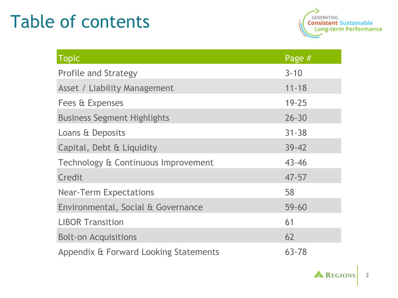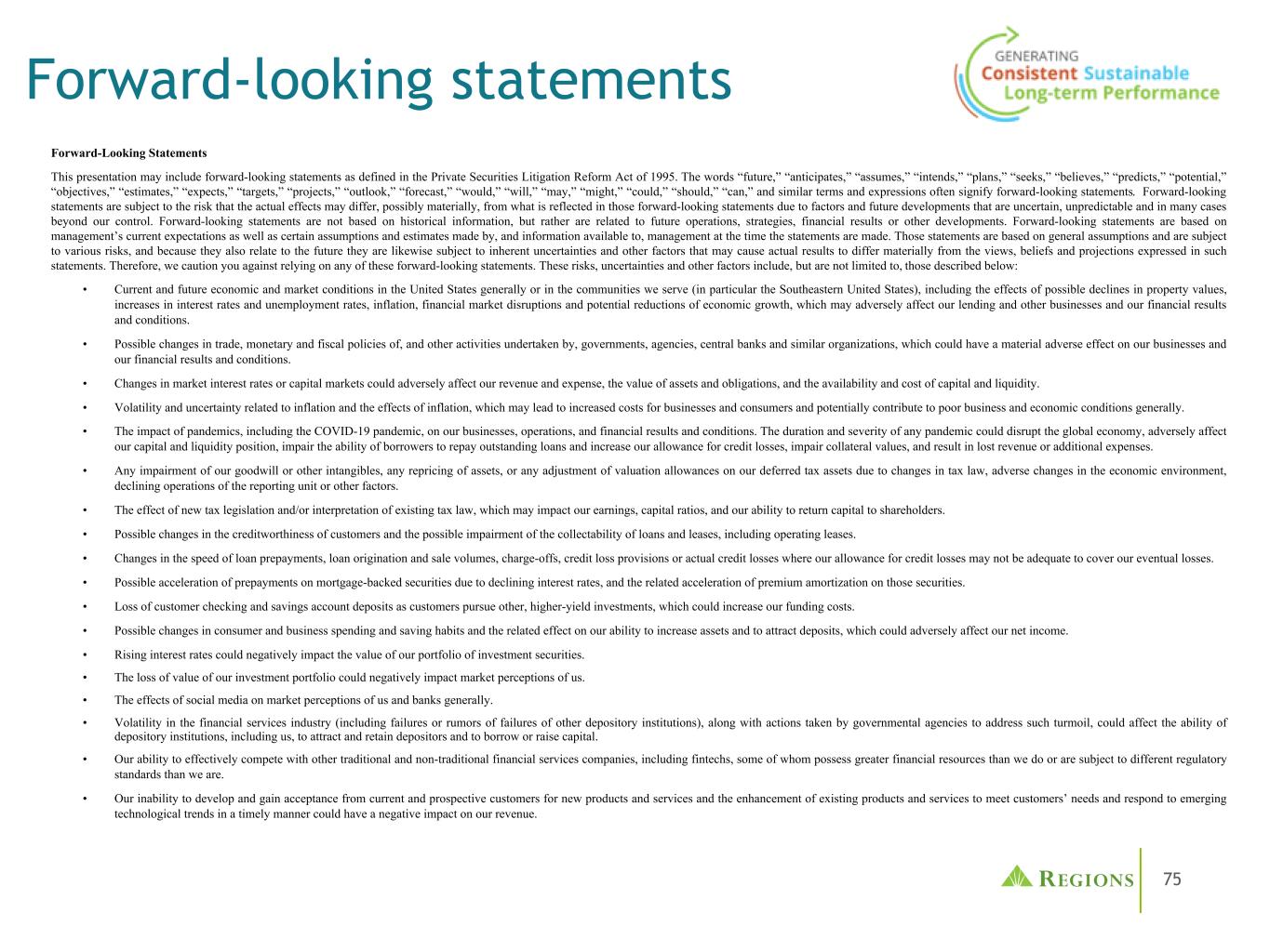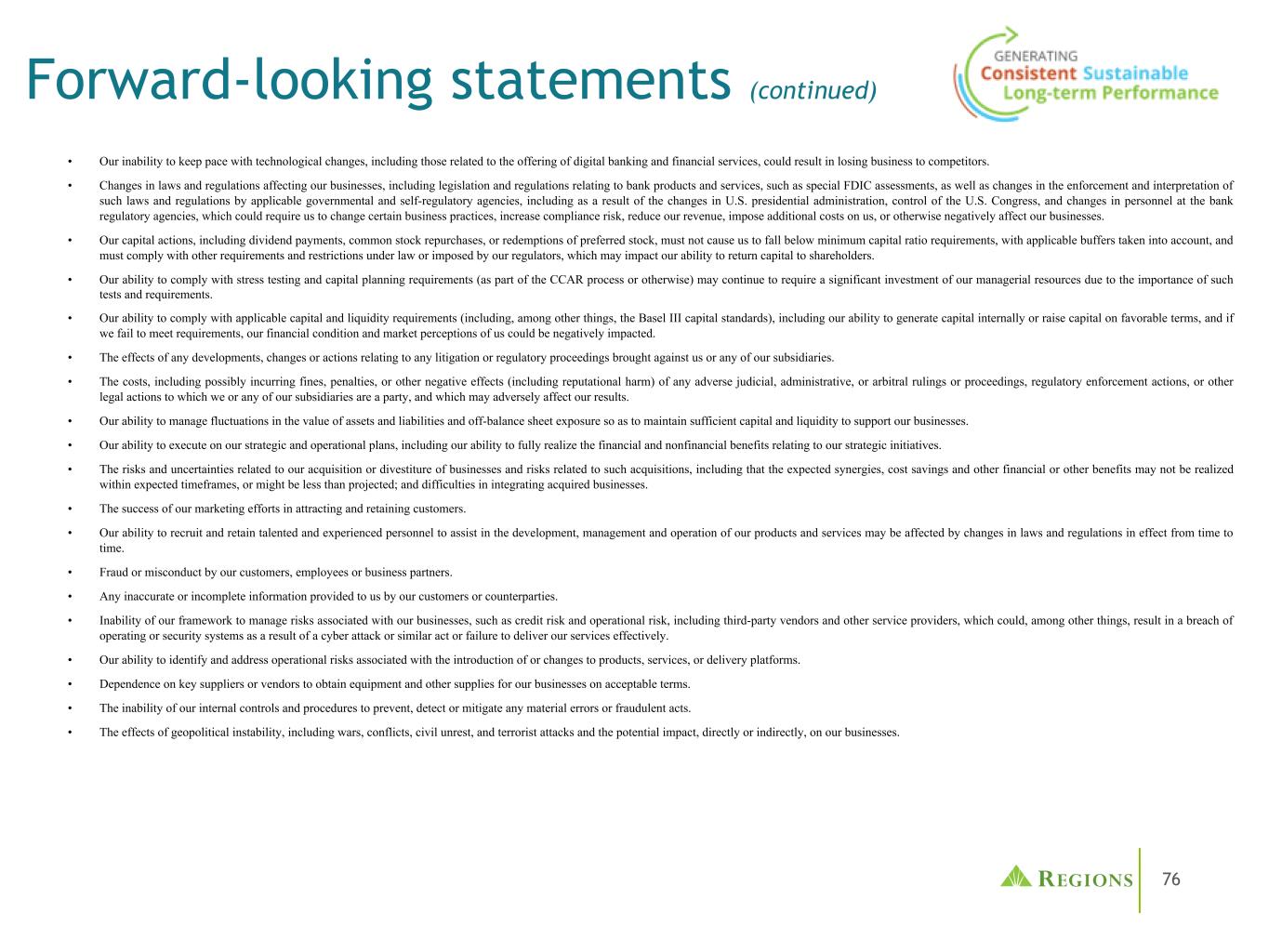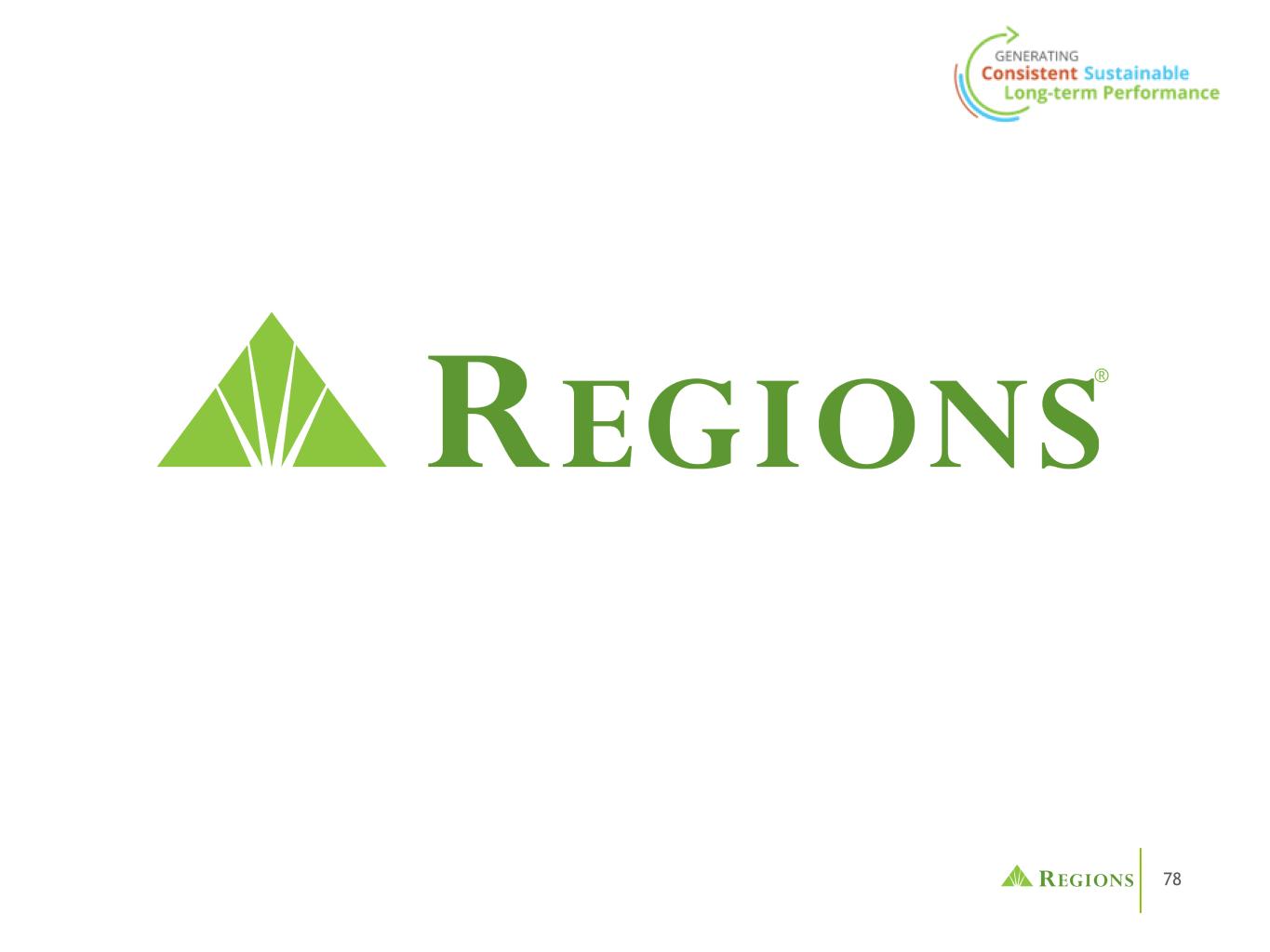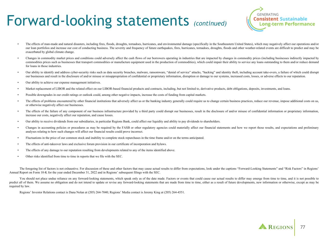 77 •人为和自然灾害的影响,包括火灾、洪水、干旱、龙卷风、飓风和环境破坏(特别是在美国东南部),这可能对我们的业务和/或贷款组合产生负面影响,并增加我们开展业务的成本。未来地震、火灾、飓风、龙卷风、干旱、洪水和其他与天气有关的事件的严重程度和频率难以预测,而且可能因全球气候变化而加剧。•商品市场价格和条件的变化可能会对在受商品价格变化影响的行业(包括受商品价格间接影响的企业,如运输商品或制造用于生产商品的设备的企业)经营的借款人的现金流产生不利影响,这可能会损害他们偿还未偿还贷款的能力和/或减少这些行业的贷款需求。•我们有能力识别和应对网络安全风险,例如数据安全漏洞、恶意软件、勒索软件、“拒绝服务”攻击、“黑客攻击”和身份盗用,包括账户接管,如果不这样做,可能会扰乱我们的业务,导致泄露和/或滥用或盗用机密或专有信息,破坏或损坏我们的系统,增加成本、损失或对我们的声誉造成不利影响。•我们实现费用管理举措的能力。• LIBOR的市场替代及其对我们基于LIBOR的金融产品和合约的相关影响,包括但不限于衍生产品、债务、存款、投资和贷款。•我们的信用评级或展望可能被下调,除其他负面影响外,可能会增加从资本市场融资的成本。•其他金融机构遇到的对我们或银行业产生不利影响的问题的影响通常可能要求我们改变某些业务做法,减少我们的收入,给我们带来额外成本,或以其他方式对我们的业务产生负面影响。•第三方提供的业务基础设施的任何部分发生故障,可能会扰乱我们的业务,导致机密信息或专有信息的泄露和/或滥用,增加我们的成本,对我们的声誉产生负面影响,并造成损失。•我们从子公司,特别是地区银行获得股息的能力,可能会影响我们的流动性和向股东支付股息的能力。•财务会计准则委员会或其他监管机构可能要求的会计政策或程序变更可能会对我们的财务报表以及我们报告这些结果的方式产生重大影响,而有关这些变更将如何影响我们的财务结果的预期和初步分析可能被证明是不正确的。•我们的普通股价格波动,无法在时间框架内和/或按照预期的条件完成股票回购。•我们的公司注册证书和章程中的反收购法律和专属法院条款的影响。•与上述任何项目有关的事态发展对我们的声誉造成的任何损害的影响。•我们在提交给SEC的报告中不时发现的其他风险。上述因素列表并非详尽无遗。有关可能导致实际结果与预期不同的这些因素和其他因素的讨论,请参阅各地区截至2022年12月31日止年度的10-K表格年度报告中的“前瞻性陈述”和“风险因素”标题,以及各地区随后提交给美国证交会的文件。您不应过分依赖任何前瞻性陈述,这些陈述仅在发布之日起生效。可能导致我们的实际结果不同的因素或事件可能不时出现,不可能预测所有这些因素或事件。我们不承担任何义务,也不打算更新或修改由于未来发展、新信息或其他原因而不时作出的任何前瞻性陈述,除非法律要求。Regions的投资者关系联系人是达纳 •诺兰,电话:(205)264-7040;Regions的媒体联系人是杰里米•金,电话:(205)264-4551。前瞻性陈述(续)