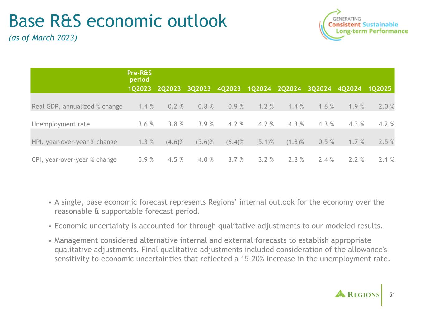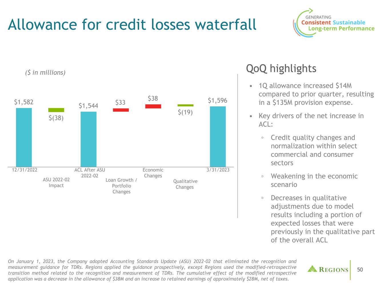 50 ACL ASU2022-02后1582美元(38)1544美元33美元(19)1596美元信贷损失准备金瀑布2023年3月31日•第一季度准备金比上一季度增加1400万美元,导致1.35亿美元的准备金支出。• ACL净增加的主要驱动因素:①特定商业和消费部门的信贷质量变化和正常化①经济情景减弱③由于模型结果导致的质量调整减少,包括部分预期损失,这些损失以前在整个ACL QoQ突出显示的质量部分(百万美元)12/31/2022 ASU 2022-02影响质量变化贷款增长/投资组合变化经济变化2023年1月1日,公司采用了会计准则更新(ASU)2022-02,取消了对TDR的确认和计量指导。各区域前瞻性地应用了该指南,但各区域使用了与贸易和发展报告的确认和计量有关的修正-回溯过渡方法。修改后的追溯适用的累积影响是,备抵减少3800万美元,留存收益增加约2800万美元(税后净额)。