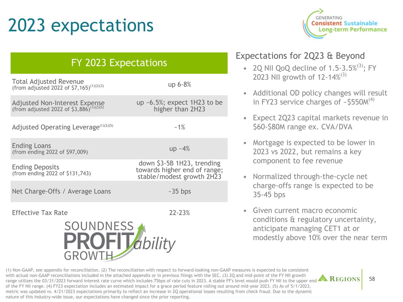 58 2023年预期(1)非公认会计原则,见附录的调节。(2)与前瞻性非GAAP指标相关的对账预计将与附录或之前提交给SEC的文件中包含的实际非GAAP对账保持一致。(3)FY NII增长区间的2Q和中间点使用03/31/2023远期利率曲线,其中包括2023年75个基点的降息。稳定的FF水平将把FY NII推至FY NII区间的高端。(4)23财年预期包括对2023年年中前后推出的宽限期功能的估计影响。(5)截至2023年5月1日,指标与2023年4月21日的预期相比有所更新,主要是为了反映支票欺诈造成的第二季度业务损失增加。由于这一全行业问题的动态性质,自上次报告以来,我们的预期发生了变化。2023财年预期调整后总收入(调整后的2022年为7165美元)(1)(2)(3)增长6-8 %调整后非利息费用(调整后的2022年为3886美元)(1)(2)(5)增长~6.5%;预期1H23将高于2H23调整后经营杠杆(1)(2)(5)~1%期末贷款(调整后的2022年为97009美元)增长~4%期末存款(调整后的2022年为131743美元)下降3-5B 1H23,趋向更高的范围;稳定/适度增长2H23净冲销/平均贷款约35个基点有效税率22-23 %预期2Q23及以后• 2Q2 NII环比下降1.5-3.5 %(3);2023财年NII增长12-14 %(3)•额外的OD政策变化将导致23财年服务费约为5.5亿美元(4)•预计2Q23资本市场收入在60-8000万美元范围内,不包括。CVA/DVA •预计2023年抵押贷款将低于2022年,但仍是收费收入的关键组成部分•正常化的全周期净冲销范围预计为35-45个基点•鉴于当前的宏观经济状况和监管不确定性,预计在近期内将CET1管理在10%或略高于10%