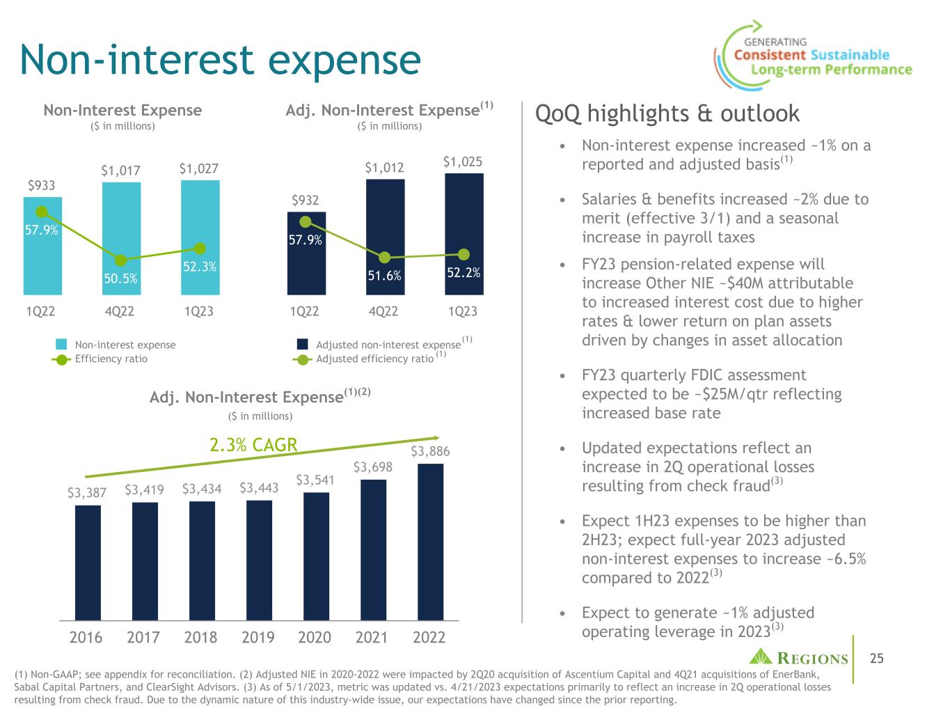 25 $ 933 $ 1,017 $ 1,02757.9% 50.5% 52.3%非利息费用效率比率1Q22 4Q22 1Q23 •非利息费用在报告和调整的基础上增加约1%(1)•工资和福利增加约2%(3/1生效)工资税季节性增加• 23财年与养老金相关的支出将增加其他NIE约4000万美元,原因是利率上升导致利息成本增加,资产分配变化导致计划资产回报率下降• 23财年FDIC季度评估预计约为2500万美元/季度,反映出基准利率上升•更新后的预期反映出支票欺诈导致的第二季度运营损失增加(3)•预计1H23支出将增加预计2023年全年调整后的非利息支出将比2022年增加约6.5%(3)•预计2023年将产生约1%的调整后经营杠杆(3)$ 932 $ 1012 $ 102557.9% 51.6% 52.2%调整后的非利息支出调整后的效率比率1Q22 4Q22 1Q23 $ 3,387 $ 3,419 $ 3,434 $ 3,443 $ 3,541 $ 3,698 $ 3,886 2016201720182019202020212022非利息支出QoQ highlights & outlookAdj。非利息费用(1)(百万美元)2.3%复合年增长率(1)(1)非公认会计原则;调节见附录。(2)2020-2022年调整后的NIE受到2Q20收购Ascentium Capital和4Q21收购EnerBank、Sabal Capital Partners和ClearSight Advisors的影响。(3)截至2023年1月5日,该指标与2023年4月21日的预期相比有所更新,主要是为了反映支票欺诈造成的第二季度业务损失增加。由于这一全行业问题的动态性质,自上次报告以来,我们的预期发生了变化。(1)非利息费用(百万美元)Adj.非利息费用(1)(2)(百万美元)
