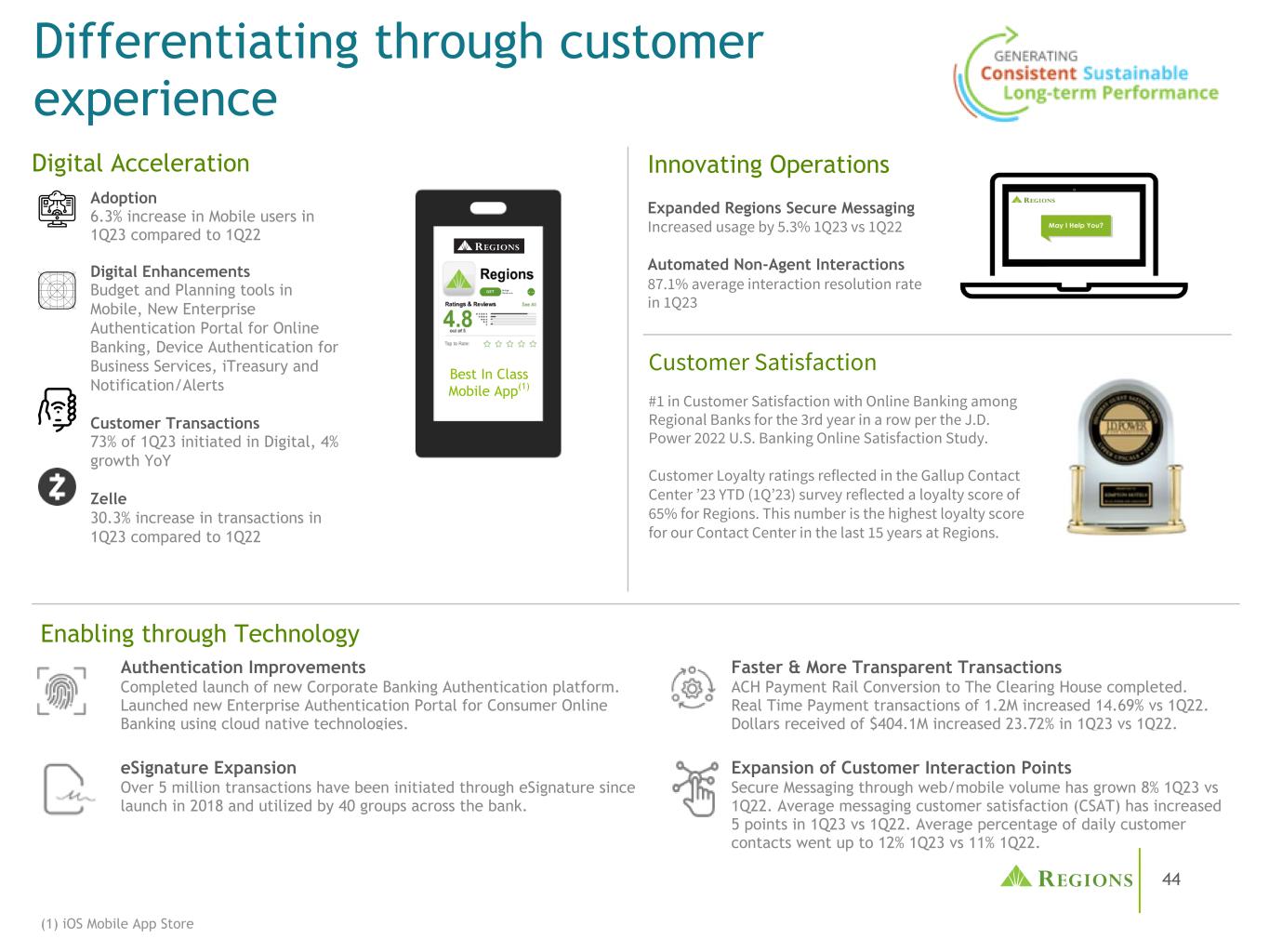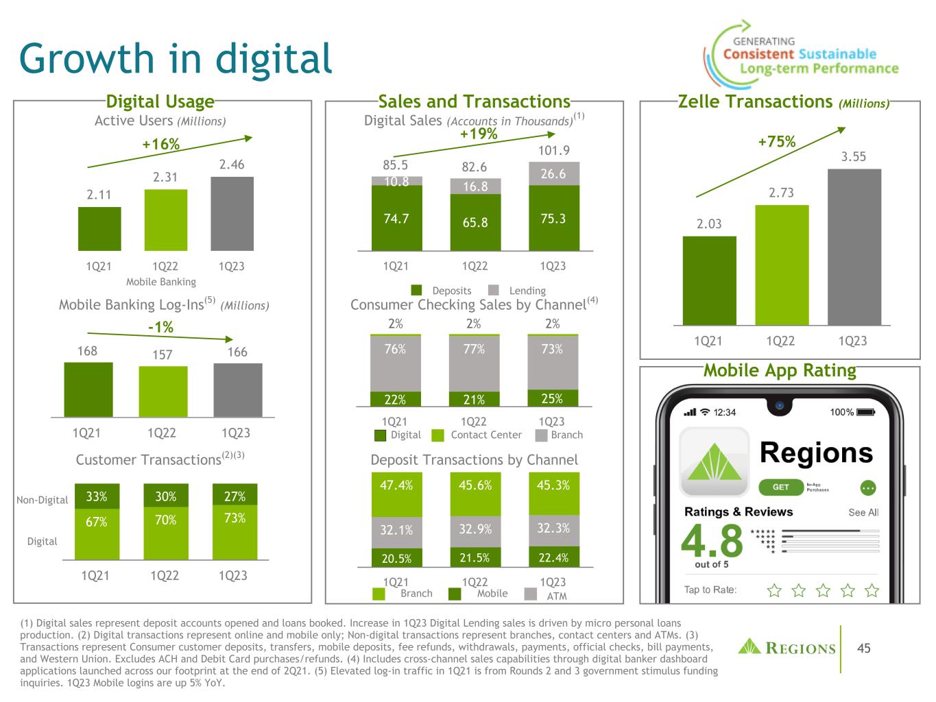 44通过客户体验实现差异化Best In Class移动应用程序(1)认证改进完成了新的公司银行认证平台的推出。使用云原生技术为消费者网上银行推出新的企业认证门户。更快和更透明的交易ACH支付轨道转换到清算所完成。实时支付交易120万笔,较2022年第一季度增长14.69%。eSignature自2018年推出以来,通过eSignature发起的交易已超过500万笔,被全行40家集团使用。客户互动点的扩展通过网络/移动通信的安全信息的数量在今年第一季度增长了8%,而在今年第一季度。平均消息客户满意度(CSAT)在23年第一季度比2022年第一季度提高了5个百分点。每日客户联系的平均百分比上升至12%,而2012年第一季度为11%。与2022年第一季度相比,2012年第一季度移动用户的采用率增加了6.3%。数字增强了移动端的预算和规划工具、用于网上银行的新的企业认证门户、用于商业服务的设备认证、iTreasury和通知/警报客户交易。同比增长4% Zelle与2022年第一季度相比增长30.3%数字加速创新运营扩展区域安全消息使用增加5.3%与2022年第一季度相比自动非代理交互87.1%平均交互解决率在《J.D. Power 2022 U.S. Banking Online Satisfaction Study》中,第三年连续第三年在区域银行的网上银行客户满意度中排名第一。盖洛普联络中心23年初至今(23年第一季度)的调查显示,各地区的客户忠诚度得分为65%。这个数字是我们联络中心在过去15年里在地区的最高忠诚分数。用户满意度(1)iOS移动应用商店通过技术赋能