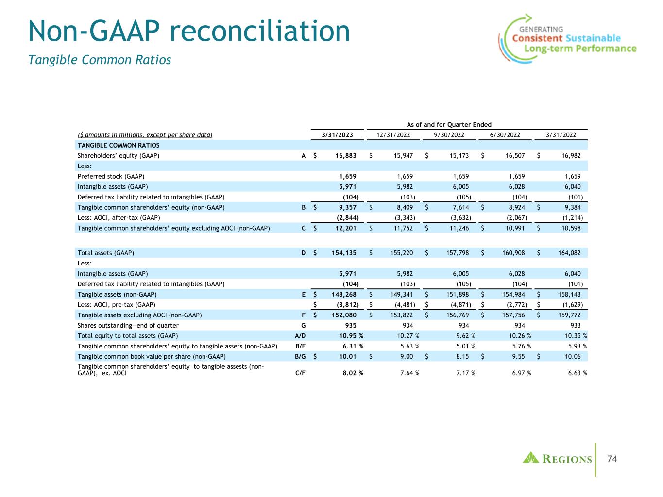 74非公认会计原则调节有形共同比率截至季度末(百万美元,每股数据除外)3/31/202312/31/20229/30/20226/30/20223/31/2022有形共同比率股东权益(GAAP)A $ 16,883 $ 15,947 $ 15,173 $ 16,507 $ 16,982减:优先股(GAAP)1,6591,6591,6591,659无形资产(GAAP)5,9715,9826,0056,0286,040与无形资产相关的递延所得税负债(GAAP)(104)(103)(105)(104)(101)有形共同股东权益(non-GAAP)B $ 9,357 $ 8,409 $ 7,614 $ 8,924 $ 9,384减:AOCI,税后(GAAP)(2,844)(3,343)(3,632)(2,067)(1,214)不包括AOCI的有形普通股股东权益(non-GAAP)C $ 12,201 $ 11,752 $ 11,246 $ 10,991 $ 10,598总资产(GAAP)D $ 154,135 $ 155,220 $ 157,798 $ 160,908 $ 164,082减:无形资产(GAAP)5,9715,9826,0056,0286,040与无形资产相关的递延所得税负债(GAAP)(104)(103)(105)(104)(101)有形资产(non-GAAP)E $ 148,268 $ 149,341 $ 151,898 $ 154,984 $ 158,143减:AOCI,税前(GAAP)$(3,812)$(4,481)$(4,871)$(2,772)$(1,629)不包括AOCI的有形资产(non-GAAP)F $ 152,080 $ 153,822 $ 156,769 $ 157,756 $ 159,772流通股——季度末G 935934934933总股本与总资产之比(GAAP)A/D 10.95% 10.27% 9.62% 10.26% 10.35%有形普通股股东权益与有形资产之比(non-GAAP)B/E 6.31% 5.63% 5.01% 5.76% 5.93%每股有形普通股账面价值(non-GAAP)B/G $ 10.01 $ 9.00 $ 8.15 $ 9.55 $ 10.06有形普通股股东权益与有形资产之比(非GAAP),ex。AOCI C/F 8.02% 7.64% 7.17% 6.97% 6.63%