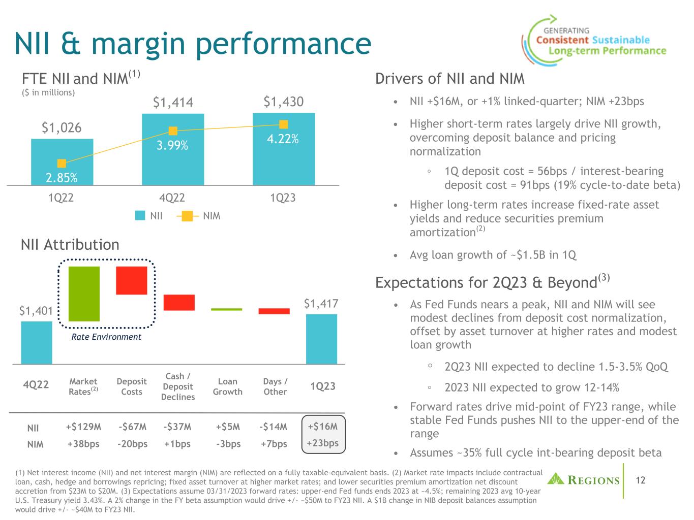 12市场利率(2)(1)净利息收入(NII)和净利差(NIM)在完全应税等值的基础上反映。(2)市场利率的影响包括合同贷款、现金、套期保值和借款的重新定价;较高市场利率下的固定资产周转率;证券溢价摊销净额折扣增加,从2300万美元降至2000万美元。(3)预期假设2023年3月31日的远期利率:高端联邦基金2023年底的收益率约为4.5%;剩余的2023年平均10年期美国国债收益率为3.43%。FY beta假设变化2%,将推动23财年净利息收入增长+/-~5000万美元。如果NIB存款余额假设发生10亿美元的变化,23财年NII将达到+/-~4000万美元。1401美元1417美元NII归属于1Q23 • NII + 1600万美元,环比+ 1%;NIM + 23个基点•较高的短期利率在很大程度上推动了NII的增长,克服存款余额和定价正常化①第一季度存款成本= 56个基点/计息存款成本= 91个基点(19%的周期至今贝塔系数)•较高的长期利率提高了固定利率资产收益率,降低了证券溢价摊销(2)•第一季度平均贷款增长约1.5B美元NII和NIM的驱动因素4Q22-20bps-3bps + 7bps + 38bps-6700万美元+ 500万美元-1400万美元+ 129MNII NIM NII &利润率表现Days/Other-3700万美元+ 1bps Rate Environment $ 1,026 $ 1,414 $ 1,4302.85% 3.99% 4.22% 1Q224Q221Q232Q23及以后的预期(3)•随着联邦基金接近峰值,NII和NIM将因存款成本正常化而略有下降,被较高利率下的资产周转率和适度的贷款增长所抵销③ 2Q23 NII预计将环比下降1.5-3.5 % ① 2023 NII预计将增长12-14 %•远期利率推动23财年区间的中点,而稳定的联邦基金将NII推高至区间的上端•假设约35%的全周期有息存款beta NII FTE NII和NIM(1)(百万美元)NIM存款成本现金/存款下降贷款增长+ 1600万美元+ 23个基点