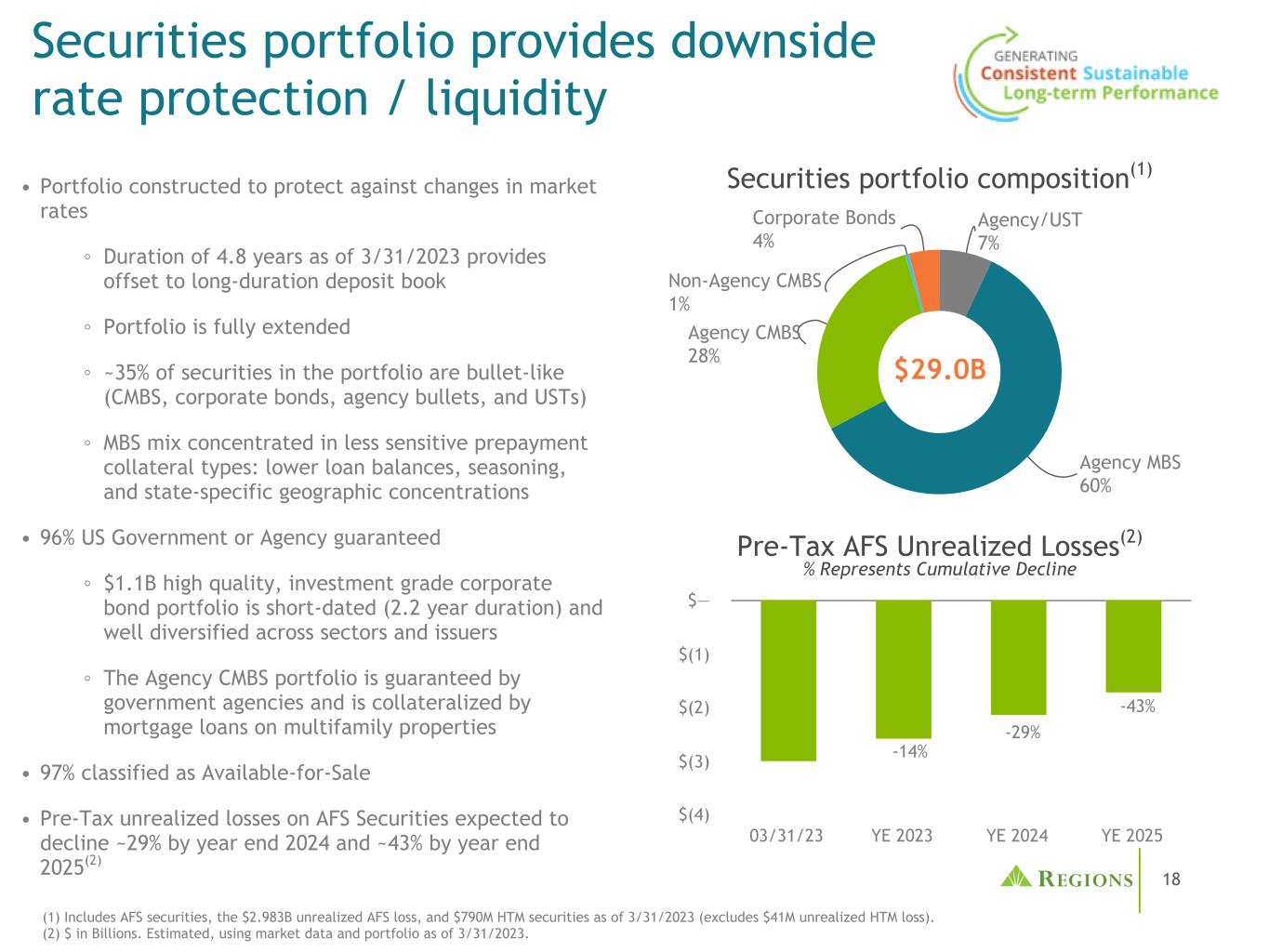 16对长期利率的敏感度•每年约15B美元的固定利率贷款生产和证券再投资;主要受到中间期限利率的影响•由于较低的预付速度和较低的每月再投资购买价格,保费摊销减少资产敏感的资产负债表对短期利率的敏感度•约55%的浮动利率贷款,不包括套期保值;远期启动套期保值保护在2023年期间增加•大,稳定的存款融资基础和历史上较低的贝塔系数净利息收入敏感性驱动因素预计2023年敏感性将因远期开始对冲而下降和存款行为的预期变化(1)平行瞬时冲击表示未来12个月NII的差异,使用远期收益率曲线&基准企业预测资产负债表指引(2)利率冲击上升的结果包括存款余额组合在12个月的衡量范围内从无息余额转变为计息(定期存款)的影响具有吸引力的长期NIM范围(3.60-4.00 %);受到良好保护,不受利率下降的影响存款行为假设敏感度+ 100个基点的假设(1)标准假设假设冲击冲击影响远期(Base)贝塔值:30年代中期;增量利率贝塔值:比基准高出约40% +/-5%贝塔值-/+ 4000万美元-今年上半年存款径流为3-5B美元(所有情形)+/-S1B额外存款径流-/+ 2400万美元存款组合变动(2):+ 4B +/-S1B额外组合变动-/+ 2500万美元资产负债表定位•在宏观环境和存款表现不确定的情况下保持适度的资产敏感性①资产久期= 2.7年;负债久期= 3.4年,使用历史信息近似值•远期起始对冲将在2023年剩余时间内降低资产敏感性•构建资产负债表概况,长期NIM目标范围在3.60%至4.00%之间;将高于该范围,直到存款贝塔将12个月NII变化与远期(基准)平行正常化,瞬时利率冲击+ 6200万美元+ 25至5000万美元-50至7500万美元-1.76亿美元Fwds(Base)3/31/23(1)12/31/2312个月开始+ 100bps-100bps