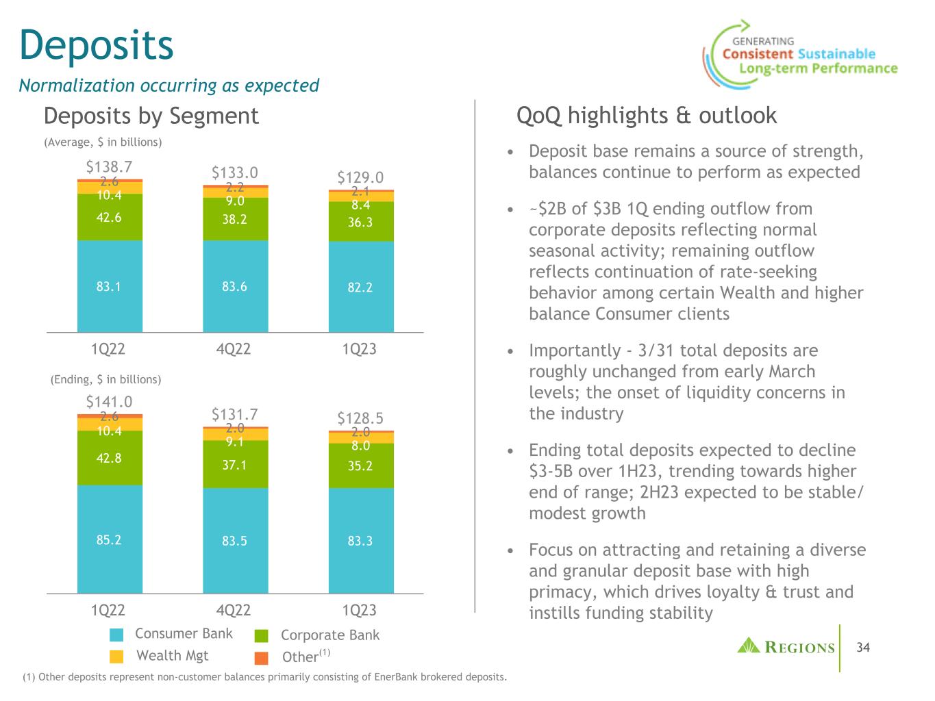 34 $ 141.0 $ 131.7 $ 128.585.28 3.58 3.34 2.83 7.13 5.2 10.49.18.0 2.6 2.0 2.0 2.0 1Q22 4Q22 1Q23 $ 138.7 $ 133.0 $ 129.08 3.18 3.68 2.24 2.638.2 36.3 10.49.08.4 2.6 2.2 2.1 1Q22 4Q22 1Q23存款正常化按预期发生(1)其他存款指主要由能源银行经纪存款组成的非客户余额。Wealth Mgt Other(1)Consumer Bank Corporate Bank QoQ Highlights & Outlook • Deposit base remains a source of strength,balance continues to perform as expected • $ 2B of $ 3B 1Q closing from corporate deposits reflecting normal seasonal activity;remaining outflowing reflects continuing rate seeking behavior in certain Wealth and higher balance Consumer clients • Importantly-3/趋向区间高端;预计2H23将保持稳定/适度增长•专注于吸引和保留多样化和颗粒度高的存款基础,这将提高忠诚度和信任,并灌输资金稳定性(期末,以十亿美元计)按部门划分的存款(平均,以十亿美元计)