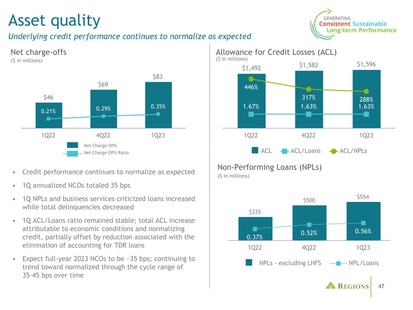 47 •信贷业绩继续按预期正常化•第一季度按年计算的NCO总数为35个基点•第一季度不良贷款和受到批评的商业服务贷款增加,而拖欠贷款总额下降•第一季度ACL/贷款比率保持稳定;由于经济状况和信贷正常化,ACL总额增加,由于取消贸易和发展报告贷款的会计核算而导致的减少,部分抵消了这一影响•预计2023年全年的不良贷款率约为35个基点;随着时间的推移,在35-45个基点的周期范围内继续趋向正常化不良贷款(NPLs)资产质量基本信贷表现继续按预期正常化(百万美元)(百万美元)备抵信用损失(ACL)$ 1,492 $ 1,582 $ 1,5961.67% 1.63% 1.63% 446% 317% 288% ACL ACL/贷款ACL/NPLs 1Q22 4Q22 1Q23 $ 46 $ 69 $ 83 1Q22 4Q22 1Q23 0.21% 0.29% 0.35% $ 335 $ 500 $ 554 0.37% 0.52% 0.56% NPLs-excluding LHFS NPL/Loans 1Q22 4Q22 1Q23 Net check-off(百万美元)Net Charge-off Net Charge-off Ratio