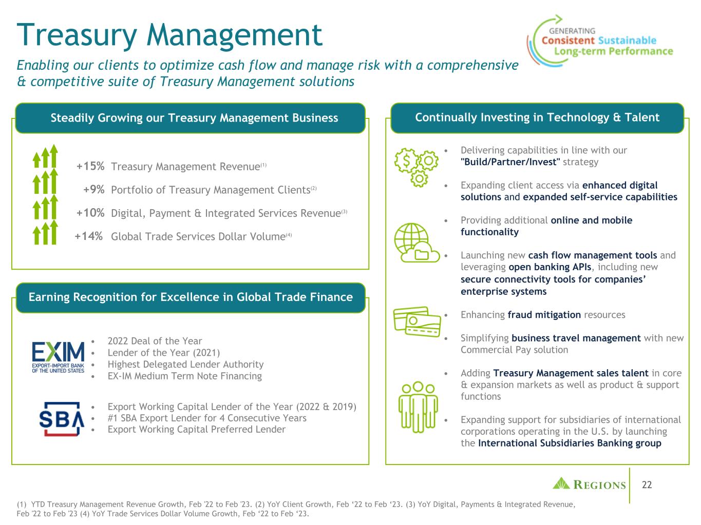 22财务管理使我们的客户能够通过一套全面且具有竞争力的财务管理解决方案优化现金流并管理风险+ 15%财务管理收入(1)+ 9%财务管理客户组合(2)+ 10%数字、支付和综合服务收入(3)+ 14%全球贸易服务美元量(4)•根据我们的“建立/合作伙伴/投资”战略提供能力•通过增强的数字解决方案和扩展的自助服务能力扩大客户访问•提供额外的在线和移动功能•推出新的现金流管理工具并利用开放银行API,包括为公司的企业系统提供新的安全连接工具•增强欺诈缓解资源•使用新的商业支付解决方案简化商务旅行管理•在核心和扩展市场增加财务管理销售人才以及产品和支持功能•通过推出国际子公司银行集团扩大对在美国经营的国际公司子公司的支持稳步发展我们的财务管理业务赢得全球贸易融资卓越认可持续投资于技术和人才•年度出口周转贷款机构(2022和2019年)• # 1 SBA出口贷款机构连续4年•出口营运资本优先贷款机构• 2022年年度交易•年度贷款机构(2021年)•最高授权贷款机构• EX-IM中期票据融资(1)年初至今财政管理收入增长,22年2月至23年2月。(2)客户增长同比,2月22日至2月23日。(3)同比数字、支付和综合收入,22年2月至23年2月(4)同比贸易服务美元数量增长,22年2月至23年2月。