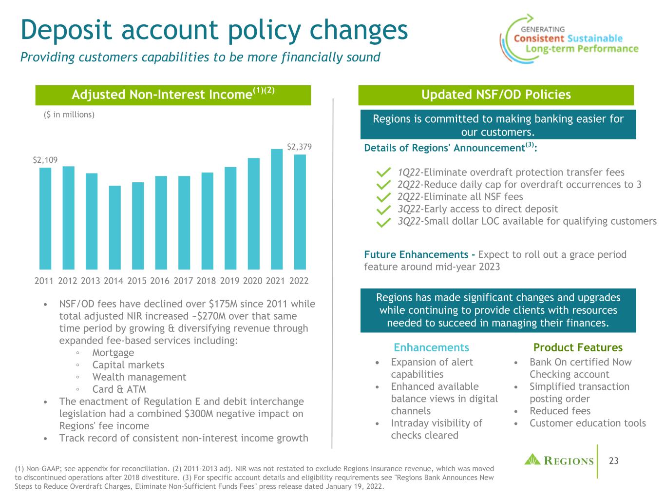 23个区域进行了重大改革和升级,同时继续向客户提供成功管理其财务所需的资源。地区公告详情(3):1Q22-消除透支保护转账费用2Q22-将发生透支的每日上限降低至3 2Q22-消除所有NSF费用3Q22-提前获得直接存款3Q22-符合条件的客户可获得小额美元LOC存款账户政策变更为客户提供更稳健的财务能力更新NSF/OD政策$ 2,109 $ 2,379201120122013201420152016201720182019202020212022调整后非利息收入(1)(2)• NSF/OD费用自2011年以来下降了超过1.75亿美元,而调整后NIR总额增加了约2.7亿美元在同一时期,通过扩大收费服务来增加收入并实现收入多样化,这些服务包括:①抵押贷款③资本市场③财富管理丨卡和ATM • E条例的颁布和借记交换立法对各地区的收费收入产生了总计3亿美元的负面影响•非利息收入持续增长的记录各地区致力于为我们的客户提供更方便的银行服务。• Bank On认证的即时支票账户•简化交易过帐订单•费用降低•客户教育工具•扩展警报功能•增强数字渠道中可用的余额视图•已结清支票的日内可见性增强产品功能(1)非公认会计原则;调节见附录。(2)2011-2013年调整数NIR未被重述以排除地区保险收入,该收入在2018年剥离后转移至已终止业务。(3)有关具体账户详情和资格要求,请参阅2022年1月19日《地区银行宣布减少透支费用、消除资金不足费用的新措施》新闻稿。(百万美元)Future Enhancements-预计将在2023年年中前后推出宽限期功能