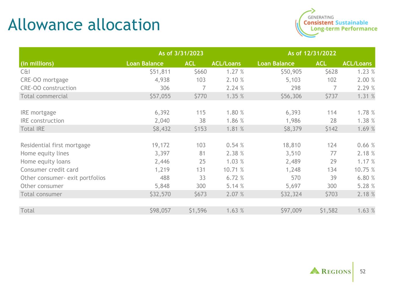 52 As of 3/31/2023 As of 12/31/2022(in millions)Loan Balance ACL ACL/Loans Loan Balance ACL ACL/Loans C & I $ 51,811 $ 6601.27% $ 50,905 $ 6281.23% CRE-OO mortgage 4,9381032.10% 5,1031022.00% CRE-OO construction 30672.24% 29872.29% Total commercial $ 57,055 $ 7701.35% $ 56,306 $ 7371.31% IRE mortgage 6,3921151.80% 6,3931141.78% IRE construction 2,040381.86% 1,986281.38% Total IRE $ 8,432 $ 1531.81% $ 8,379 $ 143,397812.38% 3,510772.18%房屋净值贷款2,446251.03% 2,489291.17%消费信用卡1,21913110.71% 1,24813410.75%其他消费者退出投资组合488336.72% 570396.80%其他消费者5,8483005.14% 5,6973005.28%消费者总额$ 32,570 $ 6732.07% $ 32,324 $ 7032.18% Total $ 98,057 $ 1,5961.63% $ 97,009 $ 1,5821.63% Allowance allocation