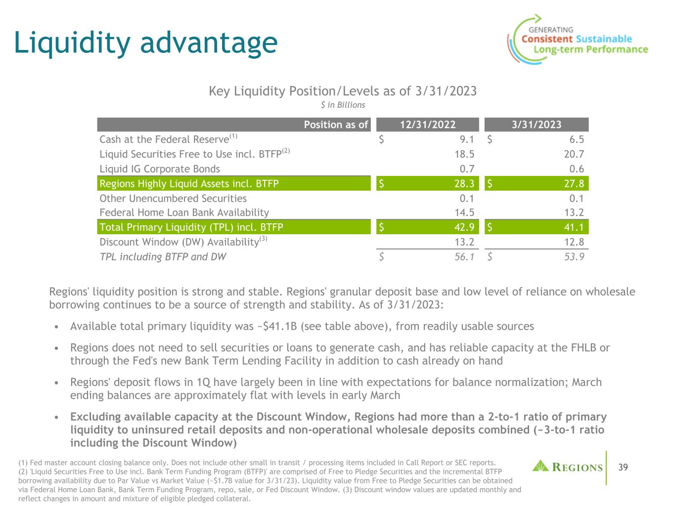 39流动性优势(1)仅限美联储主账户期末余额。不包括Call Report或SEC报告中包含的其他在运输/处理中的小项目。(2)自由使用的流动证券,包括。银行定期融资计划(BTFP)'包括免费质押证券和由于票面价值与市场价值(3/31/23的约1.7B美元价值)而增加的BTFP借款可用性。从自由到质押证券的流动性价值可以通过联邦Home Loan银行、银行定期融资计划、回购、出售或联邦贴现窗口获得。(3)贴现窗口价值每月更新,反映合格抵押担保品的数量和组合的变化。各地区的流动性状况强劲而稳定。各地区细粒度的存款基础和对批发借贷的低依赖程度,继续是实力和稳定性的来源。截至2023年3月31日:•可用的主要流动资金总额约为41.1B美元(见上表),来自随时可用的来源•各地区不需要出售证券或贷款来产生现金,除了手头已有的现金外,它们在FHLB或通过美联储新的银行定期贷款安排拥有可靠的能力•各地区第一季度的存款流动基本符合平衡正常化的预期;3月期末余额与3月初的水平大致持平•不包括贴现窗口的可用能力,截至12/31/20223/31/2023,各地区的初级流动性与未保险零售存款和非经营性批发存款的比率超过2比1(约3比1,包括贴现窗口)。美联储现金(1)9.1美元6.5美元可自由使用的流动性证券,包括。BTFP(2)18.52 0.7流动性IG公司债券0.7 0.6地区高流动性资产包括BTFP 28.3美元27.8美元其他未支配证券0.10.1联邦Home Loan银行可用性14.51 3.2主要流动性总额(TPL),包括BTFP $ 42.9 $ 41.1贴现窗口(DW)可用性(3)13.21 2.8 TPL,包括BTFP和DW $ 56.1 $ 53.9截至2023年3月31日的关键流动性头寸/水平十亿美元