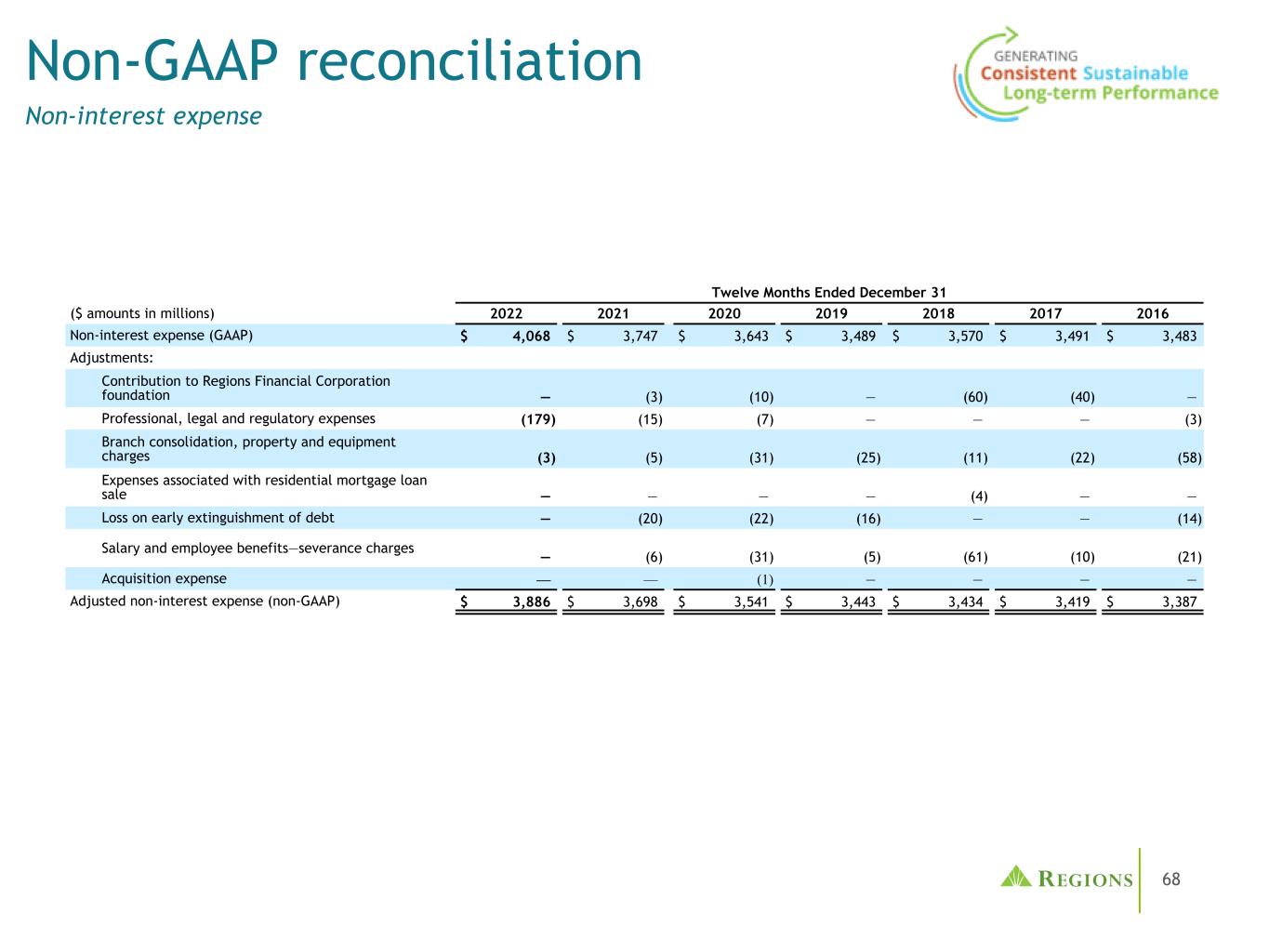 68非GAAP调节非利息费用截至12月31日的12个月(百万美元)2022202120202019201820172016非利息费用(GAAP)4068美元3747美元3643美元3489美元3570美元3491美元3483美元调整:对地区金融公司基金会的捐款——(3)(10)——(60)(40)——专业、法律和监管费用(179)(15)(7)——(3)分支机构合并,财产和设备费用(3)(5)(31)(25)(11)(22)(58)与住宅抵押贷款出售有关的费用————(4)——债务提前清偿损失——(20)(22)(16)——(14)工资和雇员福利——遣散费——(6)(31)(5)(61)(10)(21)购置费用——(1)————调整后的非利息费用(非公认会计原则)3,886美元3,698美元3,541美元3,443美元3,434美元3,434美元3,419美元3,387