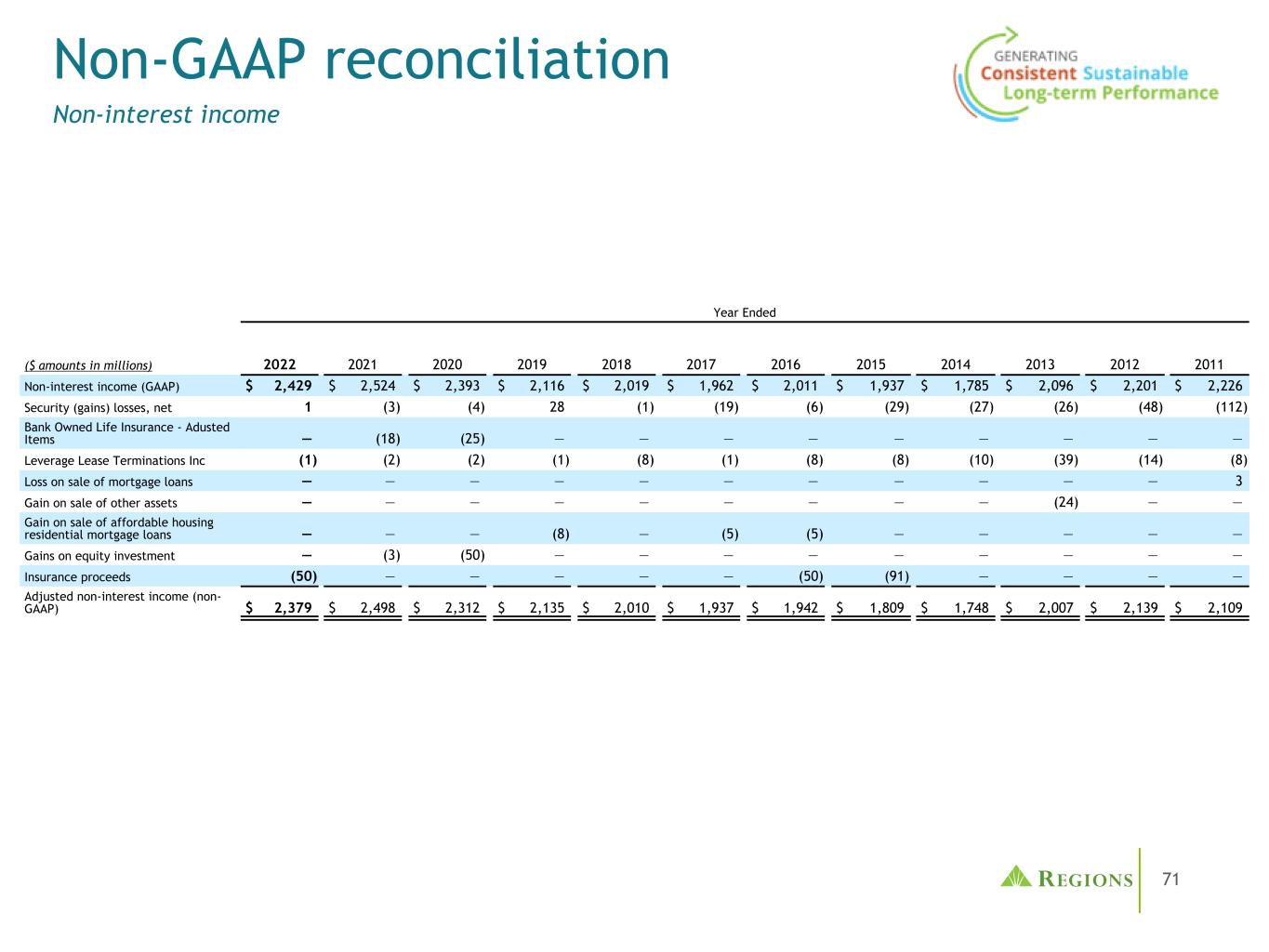 71非GAAP调节非利息收入年终(百万美元)2022202120202201920182017201620152014201320122011非利息收入(GAAP)2429美元2524美元2393美元2116美元2,0 19美元1,962美元2,0 11美元1937美元1,785美元2096美元2,201美元2,226美元安保(收益)损失,净值1(3)(4)28(1)(19)(6)(29)(27)(26)(48)(112)银行自有人寿保险-加厚项目—(18)(25)—————————— Leverage Lease Terminations Inc(1)(2)(2)(1)(8)(1)(8)(8)(10)(39)(14)(8)出售抵押贷款损失———————————— 3出售其他资产收益————————(24)——出售保障性住房住宅抵押贷款收益————(8)——(5)——————股权投资收益——(3)(50)————————保险收益(50)————(50)(91)————调整后的非利息收入(非公认会计原则)2379美元2498美元2312美元2135美元2010美元1937美元1942美元1809美元1748美元20007美元2139美元2109美元