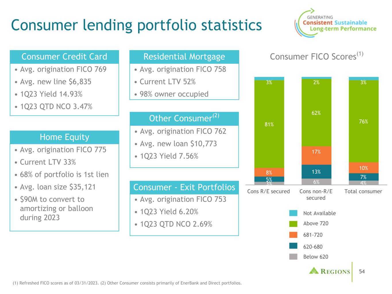 54消费贷款组合统计数据•平均发起FICO 758 •当前LTV 52% • 98%所有者占用•平均发起FICO 775 •当前LTV 33% •投资组合的68%为第一留置权•平均贷款规模35121美元• 9000万美元转换为摊销2023年平均发起FICO 762 •平均新贷款$ 10,773 • 1Q23收益率7.56% •平均发起FICO 753 • 1Q23收益率6.20% • 1Q23 QTD NCO 2.69% •平均发起FICO 769 •平均新贷款$ 6,835 • 1Q23收益率14.93% • 1Q23 QTD NCO 3.47% 3% 6% 4% 5% 13% 7% 8% 17% 10% 81% 62% 76% 3% 2% 3% Cons R/E secured Cons non-R/E secured Total consumer Not Available Above 720 620-680 Below 620 681-720 Consumer FICO Scores(1)Refreshed FICO scores as of 03/31/2023。(2)其他消费者主要由EnerBank和Direct投资组合组成。住宅抵押贷款消费者-退出组合消费信用卡房屋净值其他消费者(2)
