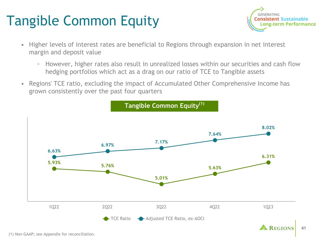 415.93% 5.76% 5.01% 5.63% 6.31% 6.63% 6.97% 7.17% 7.64% 8.02% TCE比率调整后TCE比率,不含AOCI 1Q22 2Q22 3Q22 4Q22 1Q23 4.00% 5.00% 6.00% 7.00% 8.00% 9.00%有形普通股权益(1)Non-GAAP;见附录。•较高的利率水平对各地区有利,因为净息差和存款价值都有所扩大丨然而,较高的利率也会导致我们的证券和现金流对冲投资组合出现未实现亏损,从而拖累我们的TCE与有形资产的比率•各地区的TCE比率(不包括累计其他综合收益的影响)在过去四个季度中持续增长有形普通股(1)