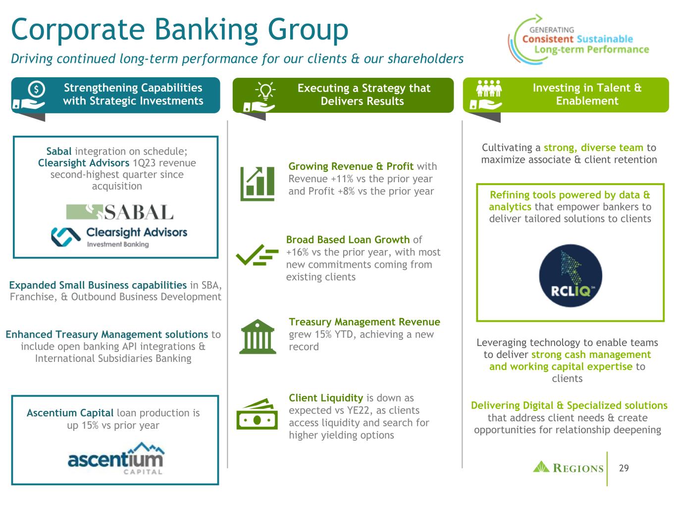 28(1)消费者银行– LOB平均存款2023年第一季度与2020年第一季度。(2)不包括小型企业。消费者银行集团通过战略投资推动增长和客户参与继续提供强劲业绩在23年第一季度交付了约23万份Greenprint个性化财务计划,同比增长,目标是深化客户关系并根据客户需求提供额外解决方案消费者存款增长+ 38%(2020-2023年)(1)向房主提供首要贷款房屋净值现代化强劲的费用管理和信贷表现,冲销55个基点(2),大大低于历史水平。成功整合EnerBank,在全业务范围内提供可靠的客户满意度和忠诚度战略投资为MLO建立更深入的潜在客户分析工具2023年第一季度收入强劲增长,收入比2022年第一季度增长22%,税前收入比2022年第一季度增长84%与2022年第一季度相比盖洛普的客户忠诚度排名第一,截至2022年第四季度的支付量和交易排名第一,新账户和总账户的Visa实力得分标枪奖2022年在线开户排名前四位盖洛普分行客户服务排名前十位