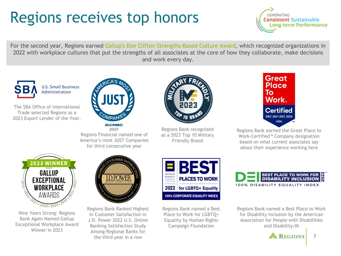 7个地区获得最高荣誉地区银行被评为2023年度十大军事友好品牌地区银行获得最佳工作场所认证™公司称号是基于当前员工对他们在这里工作的经历的评价九年强劲:地区银行再次被评为2023年盖洛普卓越工作场所奖得主地区银行在J.D. Power 2022美国网上银行满意度研究中连续第三年在地区银行中被评为最佳工作场所地区银行被评为最佳工作场所“LGBTQ + Equality by Human Rights Campaign Foundation”地区银行被美国残疾人协会评为“残疾包容最佳工作场所:IN”第二年,地区银行获得了盖洛普的唐·克利夫顿“基于优势的文化奖”,该奖项在2022年表彰那些将所有员工的优势置于日常协作、决策和工作核心的工作场所文化的组织。地区金融连续第三年被评为美国最公正的公司之一SBA国际贸易办公室将Regions评选为2023年度出口贷款机构。
