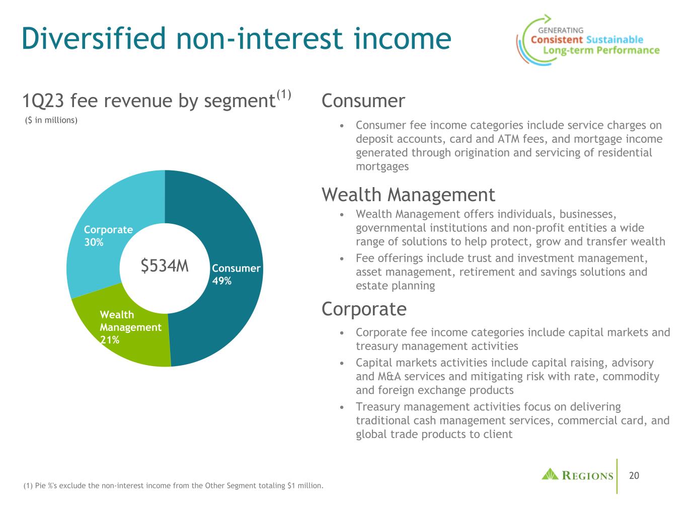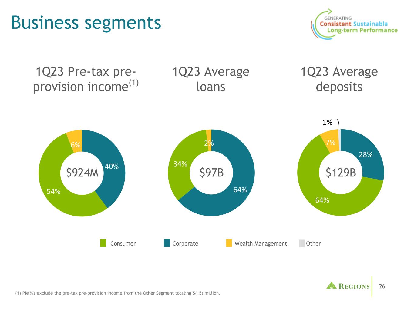 2640% 54% 6% 64% 34% 2% 28% 64% 7% 1% $ 924M $ 97B $ 129B 1Q23税前拨备前收入(1)1Q23平均存款1Q23平均贷款(1)Pie % ' s不包括来自其他部门的税前拨备前收入总计(15)百万美元。业务板块消费企业财富管理其他