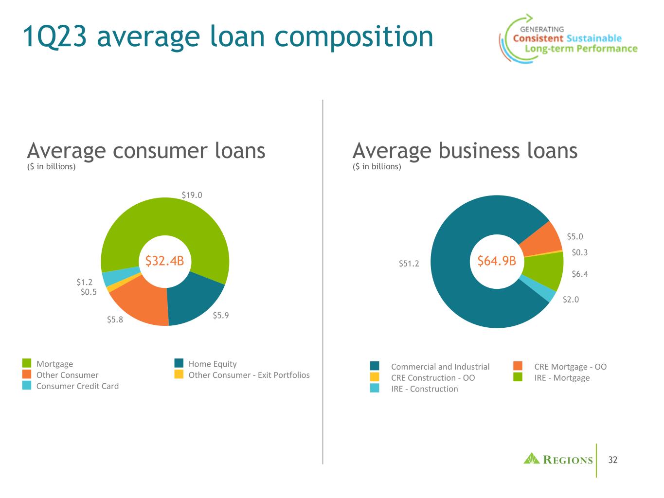 32 $ 51.2 $ 5.0 $ 0.3 $ 6.4 $ 2.0 Commercial and Industrial CRE Mortgage-OO CRE Construction-OO IRE-Mortgage IRE-Construction 1Q23平均贷款构成$ 19.0 $ 5.9 $ 5.8 $ 0.5 $ 1.2 Mortgage Home Equity Other Consumer Other Consumer-Exit Portfolios Consumer Credit Card Average Consumer Loans $ 32.4B平均商业贷款$ 64.9B(十亿美元)(十亿美元)