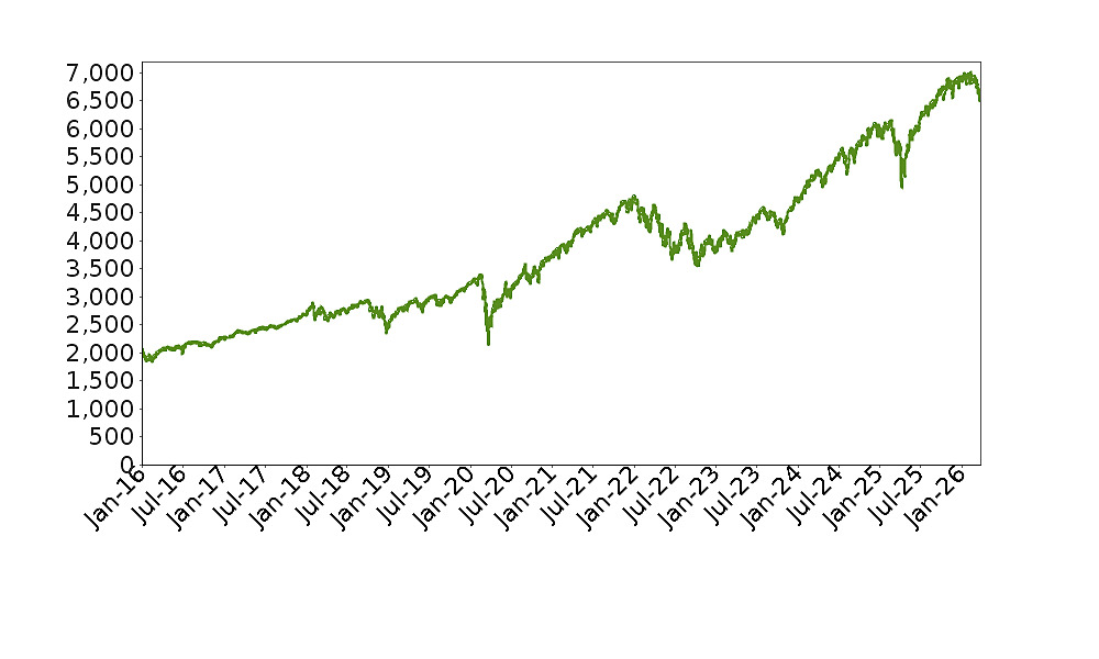 下图展示了该指数从2016年1月1日至2026年3月24日的每日历史表现。我们获取这些历史数据来自Bloomberg L.P.我们无法独立验证从Bloomberg L.P.获得的数据的准确性或完整性。截至2026年3月24日,该指数的收盘价格为6,556.37。