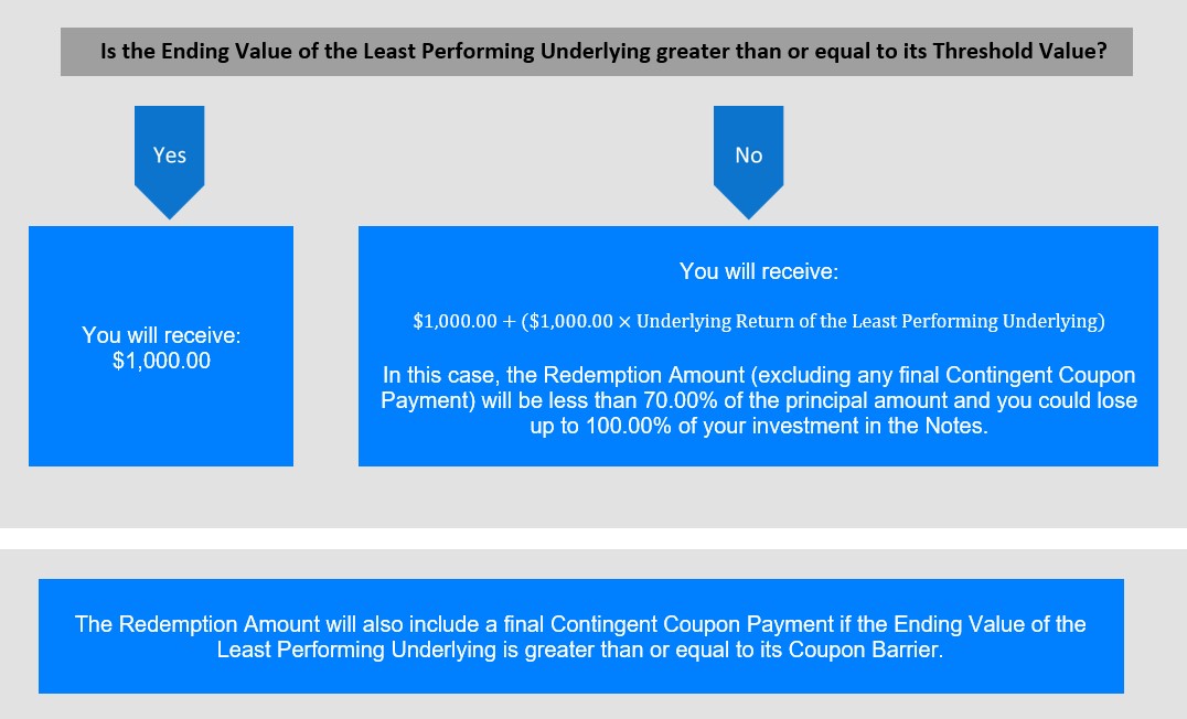 假设票据未在到期前赎回,如果任何标的较其起始价值下跌超过30%,到期时您的投资将受到表现最差标的价值下跌的1:1下行敞口,最高100%的本金面临风险;否则,到期时,您将收到本金金额。到期时,如果收盘水平为每个最终观察日标的大于或等于其起始值的70.00%。