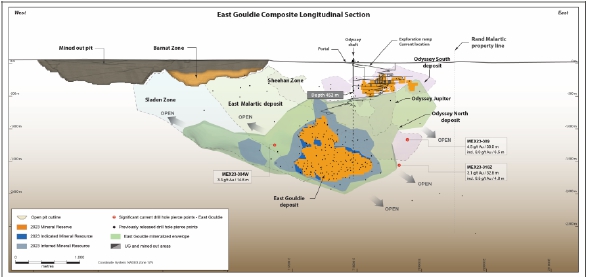 | · | 奥德赛矿山勘探取得积极成果–勘探钻探继续在East Gouldie矿产资源东部返回积极成果,包括在1,162米深度和当前矿产储量以东1,060米处超过30.0米的4.5克/吨黄金;在1,556米深度和East Gouldie矿产储量下部以东420米处超过32.8米的3.1克/吨黄金 |