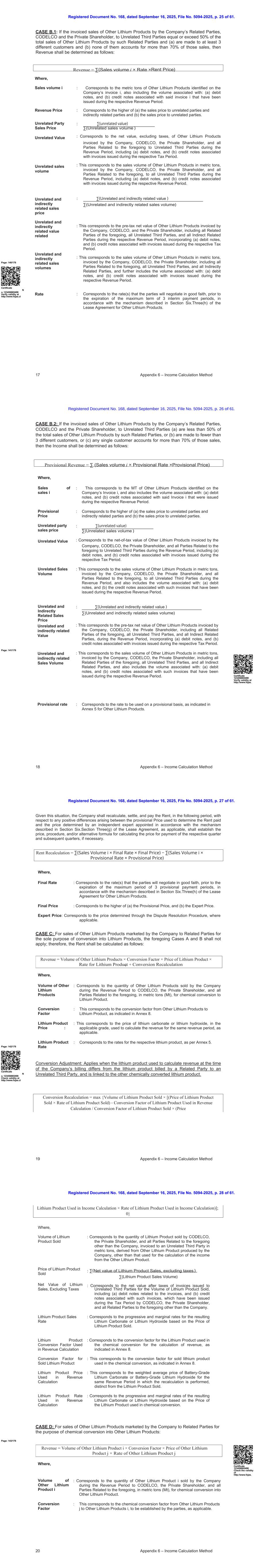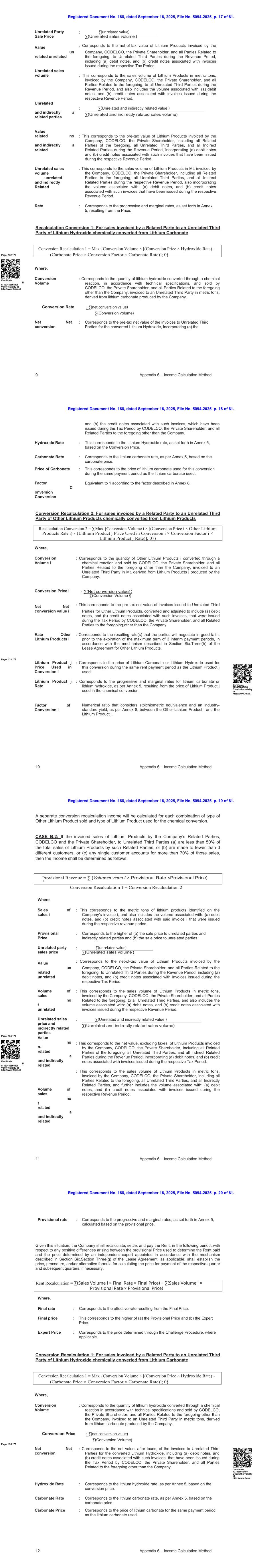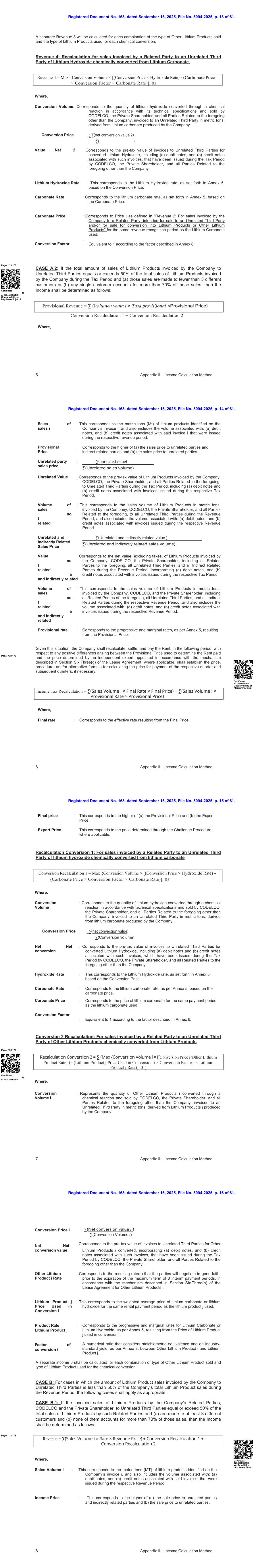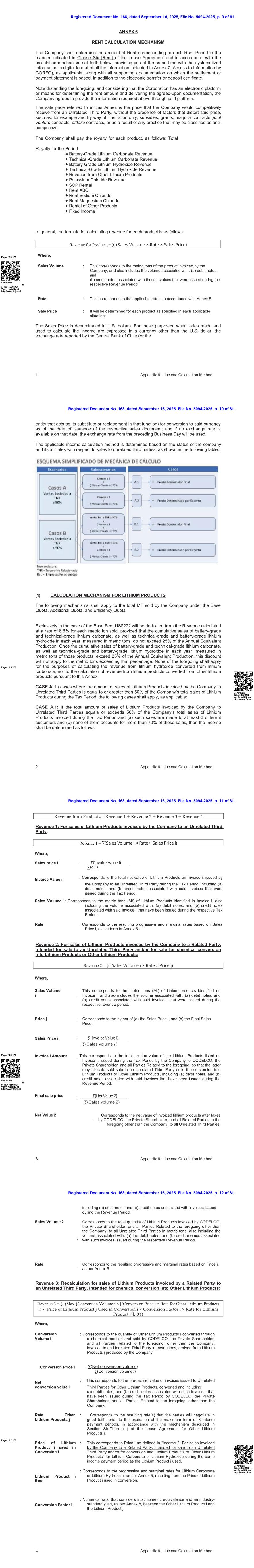 注册文件第168号,日期为2025年9月16日,档案编号5094-2025,第61页第13页。5附录6 –收入计算方法收入4 = Max { conversion volume × [(conversion price × hydroxide rate)-(carbonate price × conversion factor × carbonate rate)];0 }将对所销售的其他锂产品类型和用于每次化学转化的锂产品类型的每个组合单独计算收入3。收入4:重新计算由碳酸锂化学转化的氢氧化锂由关联方向非关联第三方开具的销售发票。其中,转换量:对应于私人股东CODELCO和除公司以外的所有前述相关方根据其技术规格通过化学转换价格反应转换并销售的氢氧化锂的数量,以公吨为单位开票给非关联第三方,源自公司生产的碳酸锂。:∑(净转换价值2)∑()价值净额2:对应于私营股东CODELCO和除公司以外的所有与上述相关的各方在纳税期内就转换后的氢氧化锂向无关联第三方开具的发票的税前价值,包括(a)借方票据,以及(b)与此类发票相关的贷方票据。氢氧化锂率:这对应于氢氧化锂率,如附件5所述,基于转换价格。碳酸盐率:对应碳酸锂率,如附件5所述,以碳酸盐价格为基础。碳酸盐价格:对应于“收入2:针对公司向关联方开具发票的销售,拟销售给非关联第三方和/或用于销售转换为锂产品或其他锂产品”中定义的与所使用的碳酸锂相同的收入确认期间的价格j。转换因子:按附件8所述因子相当于1。page:128/176证书编号123456865498在http://www.fojas.cl查有效性CASE A.2:如果公司向非关联第三方开具发票的锂产品销售总额等于或超过公司在纳税期间开具发票的锂产品销售总额的50%且(a)该等销售是向少于3个不同客户进行的或(b)任何单一客户占该等销售的70%以上,则收入确定如下:凡,暂定收益= ∑(×(×暂定价格)+转换重新计算1 +转换重新计算2登记的第168号文件,日期为2025年9月16日,档案编号5094-2025,第61页第14页。6附录6 –收入计算方法销售额i:这对应于公司发票i上确定的锂产品的公吨(MT),还包括与以下相关的数量:(a)借方票据,以及(b)在相应收入期间开具的与上述发票i相关的贷方票据。:对应于(a)向非关联方和间接关联方的销售价格与(b)向非关联方的销售价格两者中的较高者。暂定价格非关联方销售价格:∑(非关联方价值)∑(非关联方销量)非关联方价值:对应于公司、CODELCO、私人股东以及与上述相关的所有各方在纳税期间向非关联方第三方开具的锂产品发票的税前价值,包括(a)借方票据和(b)与在相应纳税期间开具的发票相关的贷方票据。销量无t相关:这对应于公司、CODELCO、私人股东和与上述相关的所有各方在收入期间向所有无关联第三方开具发票的锂产品销量公吨,还包括与以下相关的销量:(a)借方票据,以及(b)与在相应收入期间开具的发票相关的贷方票据。非关联及间接关联销售价格:∑(非关联及间接关联价值)∑(非关联及间接关联销售数量)值无t相关a及间接关联:对应公司、CODELCO、私人股东、包括前述所有关联方、所有非关联第三方、所有间接关联方在收入期间开具的锂产品发票的净值(不含税),包括(a)借方票据,以及(b)与相应税期开具的发票相关的贷方票据。销量无t相关a:这对应于锂产品销量公吨,由公司、CODELCO、私人股东,包括前述所有关联方、所有非关联第三方、所有间接关联方在各自收入期间开具发票, 并且还包括与以下相关的数量:(a)借方票据,以及(b)与在相应收入期间开具的发票相关的贷方票据。以及间接相关的暂定费率:对应于累进和边际利率,根据附件5,由暂定价产生。Page:129/176鉴于这种情况,公司应就用于确定已付租金的暂定价格与根据第六节所述机制任命的独立专家确定的价格之间产生的任何正差异,在接下来的时期内重新计算、结算和支付租金。租赁协议的第三(g)条(如适用)应确定相应季度和后续季度的支付价格计算价格的价格、程序和/或替代公式(如有必要)。其中,最终利率:对应最终价格产生的有效利率。证书123456865498在http://www.fojas查询有效性。所得税重新计算= ∑(销售量i ×最终税率×最终价格)− ∑(销售量i ×暂定税率×暂定价格)登记的第168号文件,日期为2025年9月16日,第5094-2025号文件,61号第15页。7附录6 –收益计算方法换算重新计算1 = Max {换算量× [(换算价×氢氧化率)-(碳酸盐价格×换算率×碳酸盐率)];0 }最终价格:这对应于(a)暂定价格和(b)专家价格中的较高者。专家价格:这与适用时通过质疑程序确定的价格相对应。重新计算换算1:对于由关联方向非关联第三方开具发票的由碳酸锂化学转化而来的氢氧化锂的销售,其中,换算量:对应于私人股东CODELCO和除公司以外的所有与上述相关的各方按照技术规范通过化学转换价格反应转换而销售的氢氧化锂的数量,以公吨为单位开票给非关联第三方,源自公司生产的碳酸锂。:∑(净转换价值)∑(转换量)净净转换:对应转换后的氢氧化锂给非关联第三方的发票的税前价值,包括(a)与此类发票相关的借方票据和(b)贷方票据,这些票据已在纳税期间由CODELCO、私人股东以及除公司之外的上述所有关联方签发。氢氧化率:这对应于氢氧化锂率,如附件5所述,基于转换价格。碳酸盐率:对应碳酸锂率,按附件5,以碳酸盐价格为基础。碳酸盐价格换算系数:对应与所用碳酸锂相同付款期限的碳酸锂价格。:按附件8所述因数相当于1。page:130/176证书编号123456865498在http://www.fojas.cl验证有效性转换2重新计算:对于由关联方向非关联第三方开具发票的从锂产品化学转化而来的