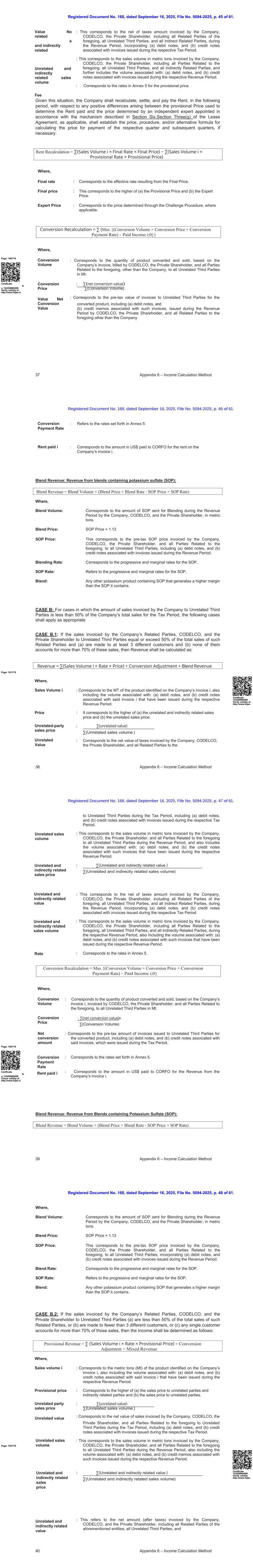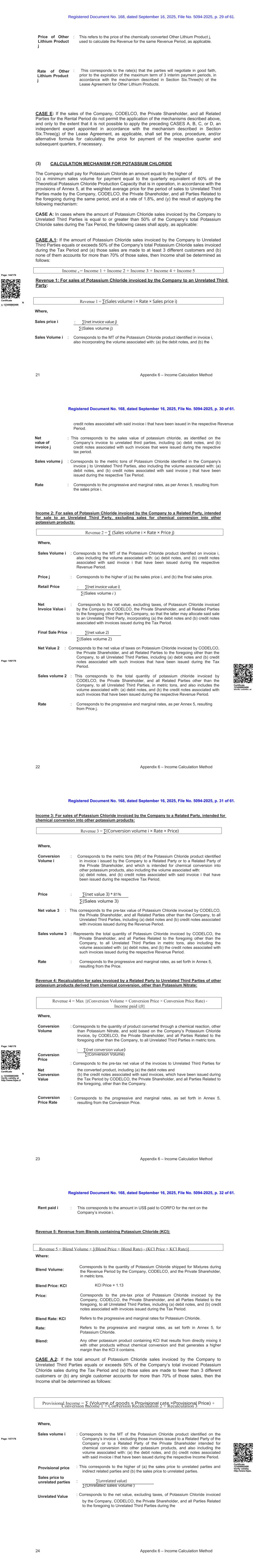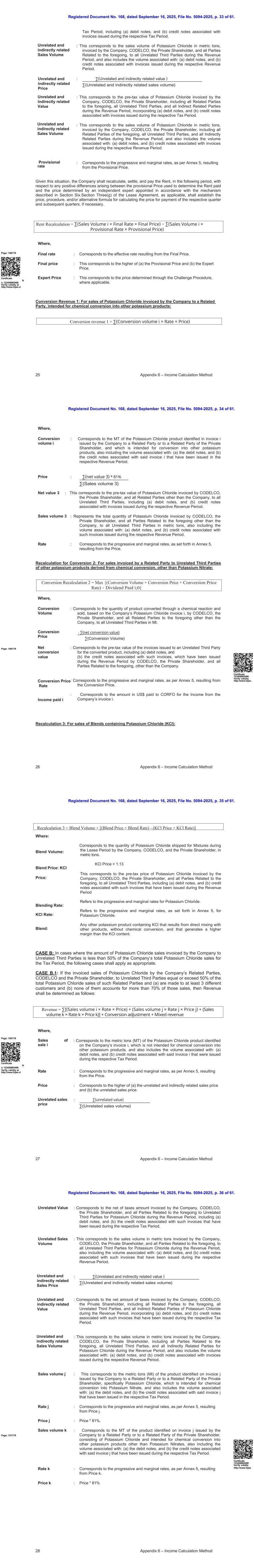 注册文件第168号,日期为2025年9月16日,档案编号5094-2025,第61页第33页。25附录6 –收入计算方法租金重新计算= ∑(销售量i ×最终利率×最终价格)− ∑(销售量i ×暂定利率×暂定价格)纳税期间,包括(a)借方票据,以及(b)与在相应纳税期间开具的发票相关的贷方票据。:这对应于公司、私人股东CODELCO和与上述相关的所有各方在收入期间向所有非相关第三方开具发票的以公吨为单位的氯化钾销量,还包括与以下相关的销量:(a)借方票据,以及(b)与在相应收入期间开具的发票相关的贷方票据。:∑(非关联及间接关联价值)∑(非关联及间接关联销量):这对应于公司、CODELCO、私人股东、包括上述所有关联方、所有非关联第三方、以及所有间接关联方在收入期间开具的氯化钾发票的税前价值,其中包含(a)借方票据,以及(b)与在相应纳税期间开具的发票相关的贷方票据。:这对应于公司、CODELCO、私人股东、包括上述所有关联方、所有非关联第三方和所有间接关联方在收入期间开具发票的氯化钾销量公吨,还包括与以下相关的销量:(a)借方票据,以及(b)与在相应收入期间开具的发票相关的贷方票据。暂定税率:对应累进和边际税率,按附件5,由暂定价格产生。鉴于这种情况,公司应在以下期间就用于确定已付租金的暂定价格与根据第六节所述机制任命的独立专家确定的价格之间产生的任何正差异重新计算、结算和支付租金。租赁协议第三节(g)(如适用)应确定相应季度和后续季度的支付价格计算价格的价格、程序和/或替代公式(如有必要)。Where,page:148/176 Certificate N o. 12 3456865498验证有效性at http://www.fojas.cl Final rate:对应最终价格产生的有效速率。最终价格:这对应于(a)暂定价格和(b)专家价格中的较高者。专家价格:这与适用时通过质疑程序确定的价格相对应。转换收入1:公司向关联方开具发票的氯化钾销售,拟用于化学转化为其他钾产品:转换收入1 = ∑(转换量i ×率×价格)不相关和间接相关的销售量不相关和间接相关的价格不相关和间接相关的价值不相关和间接相关的销售量注册文件第168号,日期为2025年9月16日,文件编号5094-2025,第61页第34页。26附录6 –收益计算方法转换重新计算2 = Max {(转换量×转换价格×转换价格率)-支付股息i;0 }其中,转换量i:对应于公司向关联方或私人股东的关联方签发的发票i中确定的氯化钾产品的MT,用于转换为其他钾产品,还包括与以下相关的数量:(a)借方票据,以及(b)已在相应收入期间签发的与上述发票i相关的贷方票据。价格:∑(净值3)*81% ∑(销量3)净值3:这对应于私人股东CODELCO和除公司以外的所有关联方向所有非关联第三方开具的氯化钾发票的税前价值,包括(a)借方票据,以及(b)与在相应收入期间开具的发票相关的贷方票据。销量3:表示私人股东CODELCO和除公司以外的所有与上述相关的各方向所有无关联第三方开具的氯化钾发票的总数量,单位为公吨,还包括与以下相关的数量:(a)借方票据,以及(b)与在相应收入期间开具的此类发票相关的贷方票据。率:对应于累进率和边际率,如附件5所述,由价格产生。转换2重新计算:对于由关联方向非关联第三方开具发票的化学转换衍生的其他钾产品的销售,硝酸钾除外:其中,转换量:对应于通过化学反应转换的产品数量和销售的转换价格, 基于公司的氯化钾发票i,由私人股东CODELCO和除公司以外的所有前述关联方向所有非关联第三方Mt.:∑(净转换价值)∑(转换量)page:149/176净转换价值转换价格率收入支付i:对应于就转换产品向非关联第三方开具的发票的税前价值,包括(a)借方票据,以及(b)与此类发票相关的贷方票据,这些发票已在营收期内由私人股东CODELCO开具,及除本公司外与前述有关的所有各方。:对应累进和边际税率,按照附件5,由转换价格产生。:对应支付给CORFO公司发票收入的美元金额i.证书123456865498验证有效性http://www.fojas。重新计算3:用于销售含氯化钾(KCL)的混合物:注册文件第168号,日期为2025年9月16日,文件编号为5094-2025,第61页第35页。27附录6 –收入计算方法收入= ∑ [(销量i ×率×价格)+(销量j ×率j ×价格j)+(销量k ×率k ×价格k)] +折算调整+混合收入对应公司、CODELCO和私人股东在租赁期内为混合物发运的氯化钾数量,单位为公吨。KCL价格× 1.13这对应于公司、CODELCO、私人股东以及与上述相关的所有各方向所有不相关第三方开具的氯化钾发票的税前价格,包括(a)借方票据,以及(b)与已在收入期间开具的此类发票相关的贷方票据,指的是氯化钾的累进和边际税率。指附件5中规定的氯化钾的累进费率和边际费率。其中:混炼量:混炼价格:KCL价格:混炼率:KCL率:混炼:任何其他含有KCL的钾产品,由与其他产品直接混合产生,无需化学转化,且产生比KCL含量更高的毛利。B类:公司向非关联第三方开具的销售氯化钾发票金额低于公司该纳税期间氯化钾销售总额的50%的情形,酌情适用以下情形。CASE B.1:如果公司关联方CODELCO和私人股东向非关联第三方开具的氯化钾销售发票等于或超过该关联方氯化钾销售总额的50%且(a)向至少3个不同的客户进行且(b)这些客户占该等销售额的比例均不超过70%,则应按以下方式确定收入:page:150/176证书编号:123456865498其中,销售i:对应于公司发票i上标识的氯化钾产品的公吨(MT),这并不是为了将化学品转化为其他钾产品,还包括与以下相关的数量:(a)借方票据,以及(b)与所述发票i相关的贷方票据,这些票据