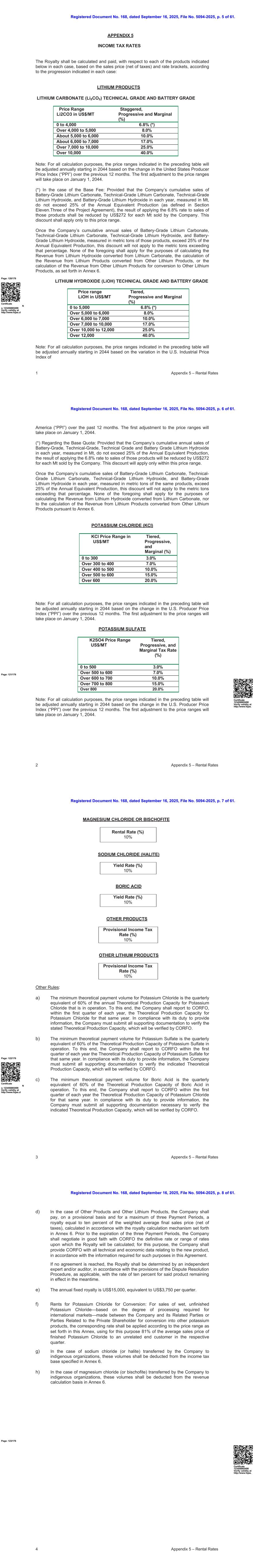 注册文件第168号,日期为2025年9月16日,档案编号5094-2025,第61页。1附录5 –租金税率附录5所得税税率应根据销售价格(税后净额)和费率括号,按照每种情况下所示的进度,就每种情况下的每一种产品计算和支付特许权使用费:锂产品碳酸锂(Li ↓ CO3)技术等级和电池等级价格范围Li2CO3美元/吨交错,进步与边际(%)0至4,0006.8%(*)超过4,000至5,0008.0%约5,000至6,00010.0%约6,000至7,00017.0%超过7,000至10,00025.0%超过10,00040.0%注:为所有计算目的,上表所示的价格范围将根据美国生产者物价指数(“PPI”)过去12个月的变化,自2044年起每年调整一次。价格区间首次调整将于2044年1月1日进行。(*)在基费的情况下:如果公司每年累计销售电池级碳酸锂、技术级碳酸锂、技术级氢氧化锂、电池级氢氧化锂,以MT计量,不超过年度当量产量的25%(定义见项目协议第11节。三),则对该等产品的销售适用6.8%费率的结果,公司每销售1 MT应减少272美元。此优惠仅适用于该价格区间。page:120/176证书编号123456865498验证有效性http://www.fojas.cl一旦公司电池级碳酸锂、技术级碳酸锂、技术级氢氧化锂、电池级氢氧化锂的年累计销量(以这些产品的公吨计量)超过年度当量产量的25%,超过该百分比的公吨将不适用此折扣。以上均不适用于计算由碳酸锂转化为氢氧化锂的收入、计算由其他锂产品转化为锂产品的收入、或计算由其他锂产品转化为其他锂产品的收入,如附件6所述。氢氧化锂(LiOH)技术等级和电池等级价格区间LiOH单位美元/吨分层、渐进和边际(%)0至5,0006.8%(*)5000至6000以上8.0% 6000至7000以上10.0% 7000至10000以上17.0% 10000至12000以上25.0% 12000以上40.0%注:为所有计算目的,上表所示的价格范围将根据2025年9月16日第168号注册文件的美国工业价格指数的变化,从2044年开始每年调整,文件编号5094-2025,第61页第6页。2附录5 –租金价格页:121/176美国(“PPI”)过去12个月。第一次价格区间调整将于2044年1月1日进行。(*)关于基数配额:前提是公司各年度电池级、技术级、技术级和电池级氢氧化锂的年累计销量,以MT计量,不超过年度当量产量的25%,则对该等产品的销售按6.8%的费率计算的结果,公司每销售1 MT将减少272美元。此优惠仅在此价格范围内适用。一旦公司每年电池级碳酸锂、技术级碳酸锂、技术级氢氧化锂、电池级氢氧化锂的累计销量,以相同产品的公吨计量,超过年度当量产量的25%,则此折扣将不适用于超过该百分比的公吨。以上各项均不适用于计算碳酸锂转化为氢氧化锂的收入,也不适用于根据附件6计算其他锂产品转化为锂产品的收入。氯化钾(KCL)KCL价格区间美元/吨分层、递进、边际(%)0至3003.0%超300至4007.0%超400至50010.0%超500至60015.0%超60020.0%注:为所有计算目的,上表所示价格区间将根据美国生产者价格指数(“PPI”)过去12个月的变化,自2044年起每年调整一次。第一次价格区间调整将于2044年1月1日进行。硫酸钾K2SO4价格区间美元/吨分级、累进、边际税率(%)0至5003.0%超过500至6007.0%超过600至70010.0%超过700至80015.0%超过80020.0%注:为所有计算目的,上表所示价格区间将根据美国生产者价格指数(“PPI”)过去12个月的变化,自2044年起每年调整一次。价格区间首次调整将于1月1日进行, 2044.证书123456865498验证有效性http://www.fojas。注册文件第168号,日期为2025年9月16日,档案编号5094-2025,第61页第7页。3附录5 –租金率租金率(%)10%收益率(%)10%收益率(%)10%暂定所得税率(%)10%暂定所得税率(%)10%镁氯化物或双鱼铁氯化钠(卤酸盐)硼酸其他产品其他锂产品其他规则:a)氯化钾的最低理论支付量为已运行的氯化钾年理论产能的60%的季度当量。为此,公司应在每年第一季度内向CORFO报告当年氯化钾理论产能。根据提供信息的职责,公司必须提交所有证明文件,以验证所述理论产能,这将由CORFO进行验证。page:122/176证书编号123456865498在http://www.fojas.cl验证有效性b)硫酸钾最低理论支付量为在运硫酸钾理论产能的60%的季度当量。为此,公司应在每年第一季度内向CORFO报告当年硫酸钾理论产能。根据提供信息的职责,公司必须提交所有证明文件,以验证所指示的理论产能,这将由CORFO进行验证。c)硼酸的最低理论支付量为运营中的硼酸理论产能的60%的季度当量。为此,公司应在每年第一季度内向CORFO报告当年氯化钾理论产能。根据提供信息的职责,公司必须提交所有必要的证明文件,以验证所示的理论产能,这些文件将由CORFO进行验证。注册文件第168号,日期为2025年9月16日,档案编号5094-2025,第61页第8页。4附录5 –租赁费率d)就其他产品和其他锂产品而言,公司应在临时基础上并在最多三个付款期内支付相当于加权平均最终销售价格(税后净额)百分之十的特许权使用费,该特许权使用费按照附件6规定的特许权使用费计算机制计算。在三个付款期到期之前,公司应与CORFO善意地协商计算特许权使用费的确定费率或费率范围;为此,公司应根据本协议中为此目的所要求的信息,向CORFO提供与新产品有关的所有技术和经济数据。如果未能达成协议,特许权使用费应由独立专家和/或审计师根据适用的争议解决程序的规定确定,并以上述产品的百分之十的费率在中位保持有效。e)年度固定特许权使用费为15,000美元,相当于每季度3,750美元。f)用于转换的氯化钾租金:用于销售湿的、未完成的氯化钾——基于国际市场所需的加工程度——公司与其关联方或与私人股东相关的各方之间为转