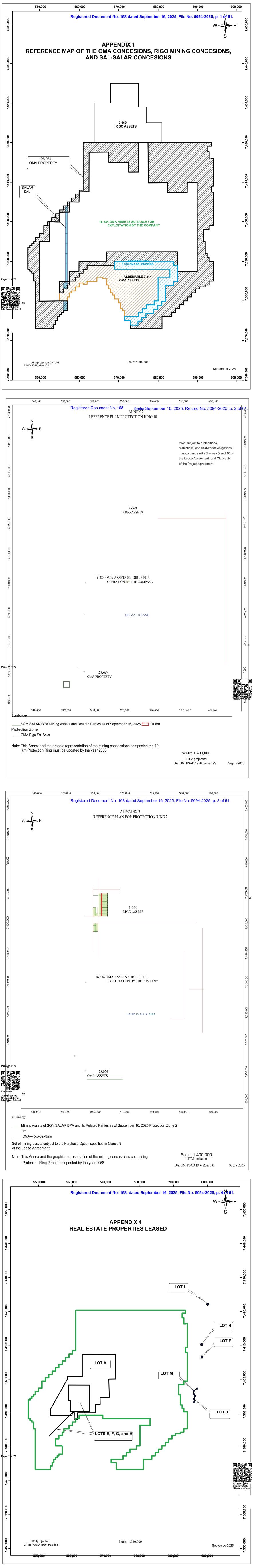 . 380,007550,000560,000560,000570,000580,000580,000580,000580,000580,000580,000590,000580,000580,000580,000580,000580,000580,000580,000580,000580,000580,000580,000560,000570,000580,000570,000580,0005附录1 OMA特许权、RIGO采矿特许权、SAL-SALAR特许权的参考地图3,660 RIGO资产28,054 OMA财产SALAR SAL 16,384 OMA资产适合公司开发无人土地1,370 OMA属地页面:116/176 ALBEMARLE 3,344 OMA资产证号123456865498查有效性http://www.fojas.cl UTM投影数据:PASD 1956,HSO19S规模:1,300,0002025年9月550,000560,000570,000570,000580,000580,000590,000600,0000007、430、0007、440、0007、450、0007、360、0007、370、0007、380、0007、390、0007、400、0007、410、0007、420、0007、430、0007、440、0007、450、0007、370、00060、000540,000550,000560,000560,000560,000570,000570,000570,000570,000登记文件第168号附件2 580,000590,000600,0002025年9月16日,记录第5094-2025号,第61页。参考计划保护环10E区域须根据租赁协议第5条和第10条以及项目协议第24条承担禁止、限制和尽最大努力义务。3,660 RIGO资产16,384 OMA资产符合“由公司运营”无人土地页:117/176 '”28,054 OMA产权证书123456865498在http://www.fojas查询有效性。Symbology 540,000 SSO,000560,000570,000570,000580,000580,000580,000590,000600,000 SQM SALAR BPA采矿资产和关联方截至2025年9月16日f“”" l 10公里保护区OMA-Rigo-Sal-Salar注:本附件和包含10公里保护环的采矿特许权的图形表示必须在2058年之前更新。规模:1:400,000 UTM投影数据:PSAD 1956,Zone 19S Sep.-2025 OQ0’0ZOL 360,0007,380,0007,400,0007,450,0007,460,0007,390,0007,410,0007,420,0007,430,0007,440,000’00380,0007,390,0007,400,0007,410,0007,430,0007,440,0007,450,0007,460,00060,000540,000 E 550,000560,000570,000570,000580,000580,000580,000580,000580,000580,000580,000580,000580,000580,000580,000580,000580,000580,000580,000580,000580,000580,000580,000580,000580,000580,000580,000580,000580,000580,000580,000580,000580,000580,000580,000580,000580,580,580,500,580,580,580,000580,580,580,580,580,580,附录3保护环的参考计划23,660 RIGO资产16,384 OMA资产受、、公司在纳迪的土地开采和*\页:118/176‘**28,054 OMA资产证号123456865498核查有效性http://www.fojas.cl u i i iuology 54000055000056000056000057000058000059000000600000 SQN SALAR BPA及其关联方截至2025年9月16日保护区2公里的矿业资产。OMA — Rigo-Sal-Salar一套受租赁协议第9条规定的购买选择权约束的采矿资产注:本附件和包含比额表:1:400,000 UTM投影保护环2的采矿特许权的图形表示必须在2058年之前更新。数据:PSAD 1956,Zone 19S Sep.-2025 000 0BC 000英镑”0P 7,380,0007,390,0007,400,0007,410,0007,420,0007,430,0007,450,0007,460,0007,370,0007400007,410,0007,420,0007,430,000360,0007,390,000440,0007,450,0007,460,00 0 70 ,0 00 7.3550,000560,000570,000570,000580,000590,000600,000登记的第168号文件,日期为2025年9月16日,档案编号5094-2025,第61页第4页。附录4房地产租赁LOT L LOT H LOT F LOT A LOT M LOT J LOTS E、F、G、H页码:119/176证书123456865498查有效性http://www.fojas。UTM投影规模:1,350,000日期:PASD 1956,HSO19S September 2025550,000560,000570,000570,000580,000590,000600,0007,350,0007,360,0007,370,0007,380,0007,390,0007,400,0007,410,0007,420,0007,440,0007,450,0007,350,0007,360,0007,380,0007,390,0007,400,0007,41 0, 00 0 7, 42 0, 00 0 7, 43 0, 00 0 7, 44 0, 00 0 7, 45 0, 00 0