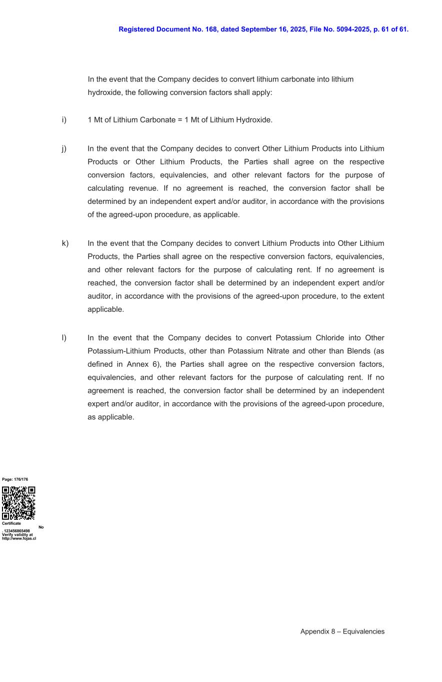 注册文件第168号,日期为2025年9月16日,档案编号5094-2025,第61页。如果公司决定将碳酸锂转化为氢氧化锂,则适用以下换算系数:i)1吨碳酸锂= 1吨氢氧化锂。j)如果公司决定将其他锂产品转化为锂产品或其他锂产品,则各方应为计算收益的目的,就各自的换算系数、当量以及其他相关因素达成一致。若未能达成一致意见,则转换系数应由独立专家和/或审计师根据商定程序的规定(如适用)确定。k)如公司决定将锂产品转换为其他锂产品,各方应为计算租金的目的就各自的转换系数、等价以及其他相关因素达成一致。若未能达成一致意见,则转换系数应由独立专家和/或审计师根据商定程序的规定在适用范围内确定。l)如果公司决定将氯化钾转换为硝酸钾和混合(定义见附件6)以外的其他钾锂产品,则各方应就各自的转换系数、当量和其他相关因素达成一致,以计算租金。如果未能达成一致意见,转换系数应由独立专家和/或审计员根据商定程序的规定酌情确定。page:176/176证书编号123456865498验证有效性http://www.fojas.cl附录8 – equivalencies