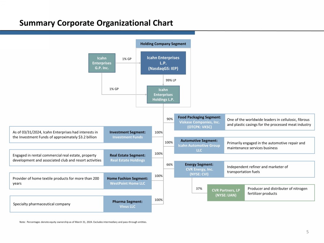 4 伊坎企业概览(1)基于2024年5月8日的收盘价18.56美元(2)投资分部总资产代表总权益(归属于IEP的权益为32亿美元)。(3)所有其他经营分部包括食品包装、家居时尚、制药。• 伊坎企业 L.P.(IEP)是一家多元化控股公司,经营投资、能源、汽车、房地产、食品包装、家居时尚和制药• IEP由Carl Icahn拥有和控制多数股权•多年来,Carl Icahn主要通过IEP为其大部分业务做出贡献并执行交易•截至2024年3月31日,Carl Icahn及其关联公司拥有IEP约85%的未偿存托单位•截至2024年5月8日,IEP拥有4美元。00年化分配,这是一个21。6%收益率(1)• IEP通过其对投资基金的投资拥有大约3美元的流动性。截至2024年3月31日的20亿美元投资(2)5,297美元0美元(553美元)(553美元)能源4,6298,824425758汽车1,9581,668(2)115房地产5011371426所有其他(3)931700589控股公司2,1050(341)(35)15,421美元11,329美元(452美元)400美元(百万美元)截至2024年3月31日的12个月截至2024年3月31日的12个月资产归属于IEP的调整后EBITDA归属于IEP净销售额和其他运营收入
